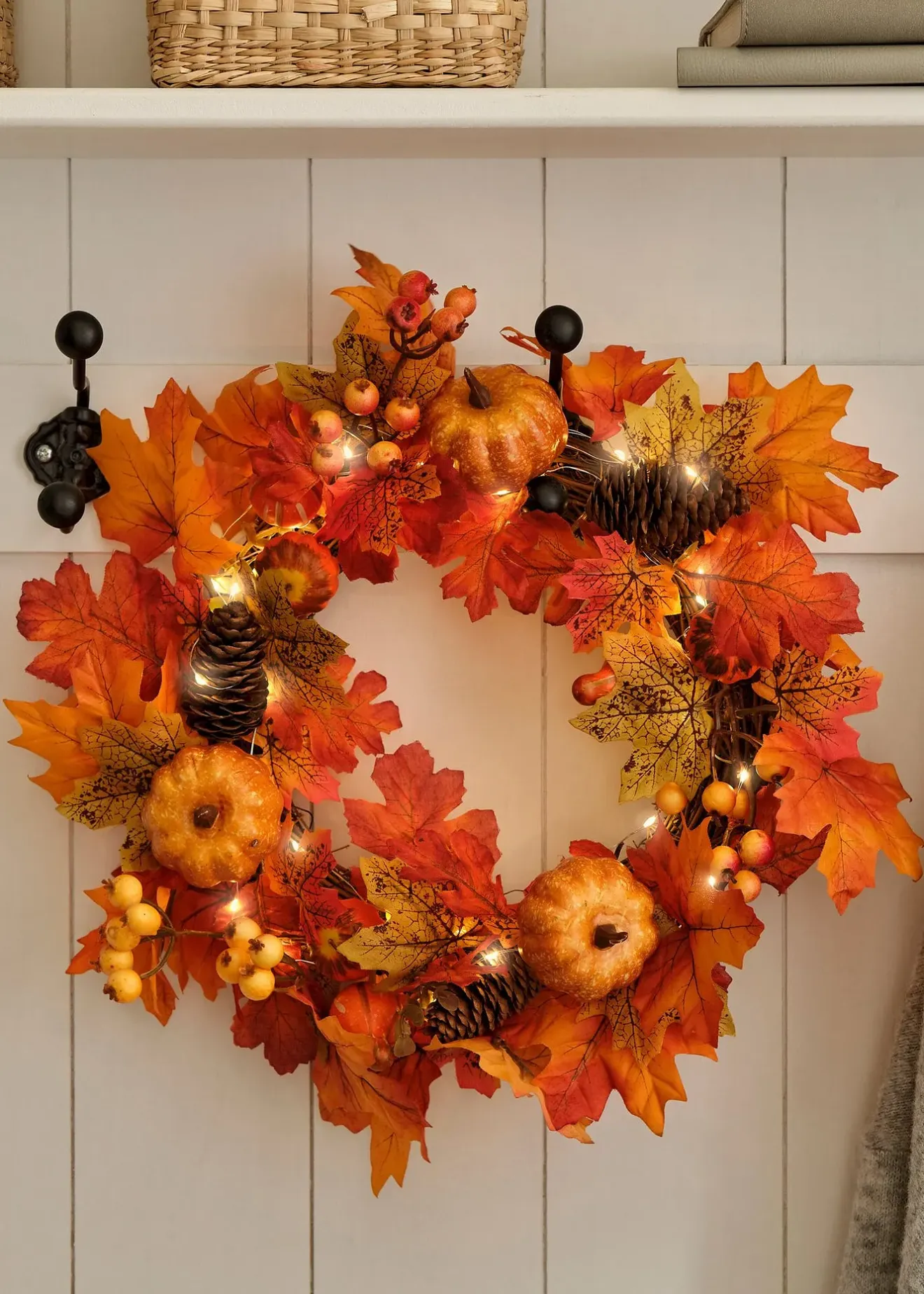 Décoration de porte automnale avec 20 LEDs, fonctionne sur piles 3x AA Mignon (non fournies). Dim. Ø env. 40 cm.