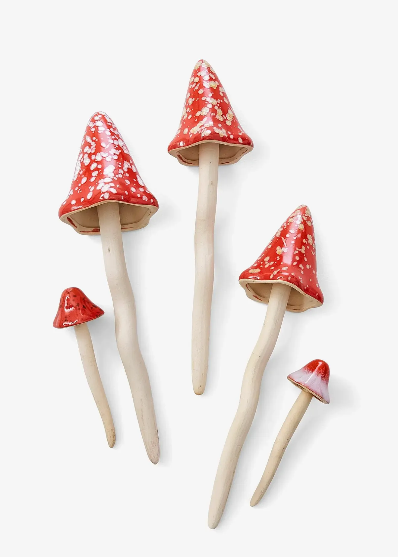 Ces champignons vacillants et colorés seront du plus bel effet dans votre jardin. Disposés les uns près des autres, vous pourrez entendre leur doux tintement à chaque brise légère. Livrés avec des tiges en céramique. Ø/H env. 31×8, 28,5×7, 15×4,5 cm.