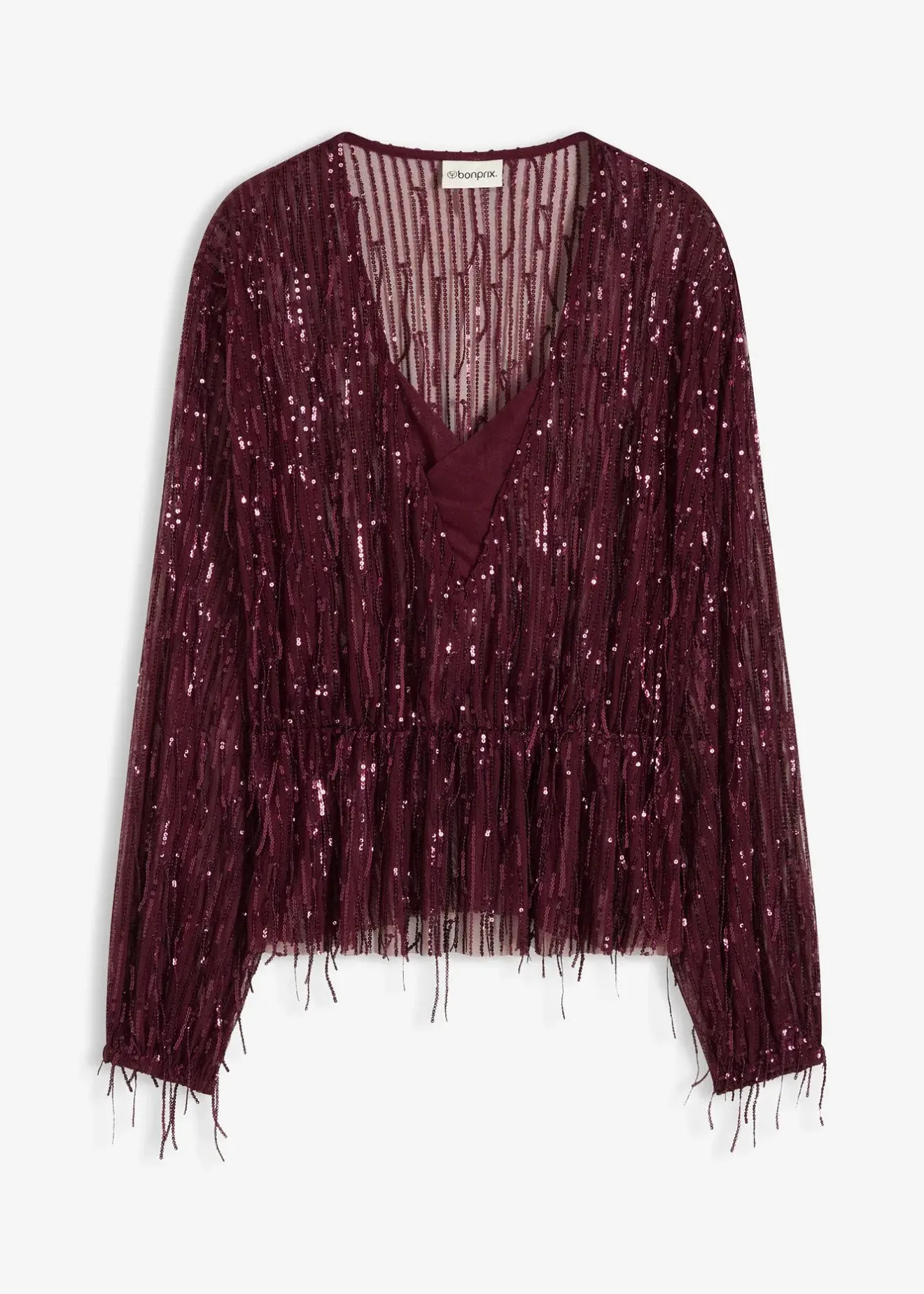 Blouse légèrement extensible et doublée à sequins, franges et décolleté profond
