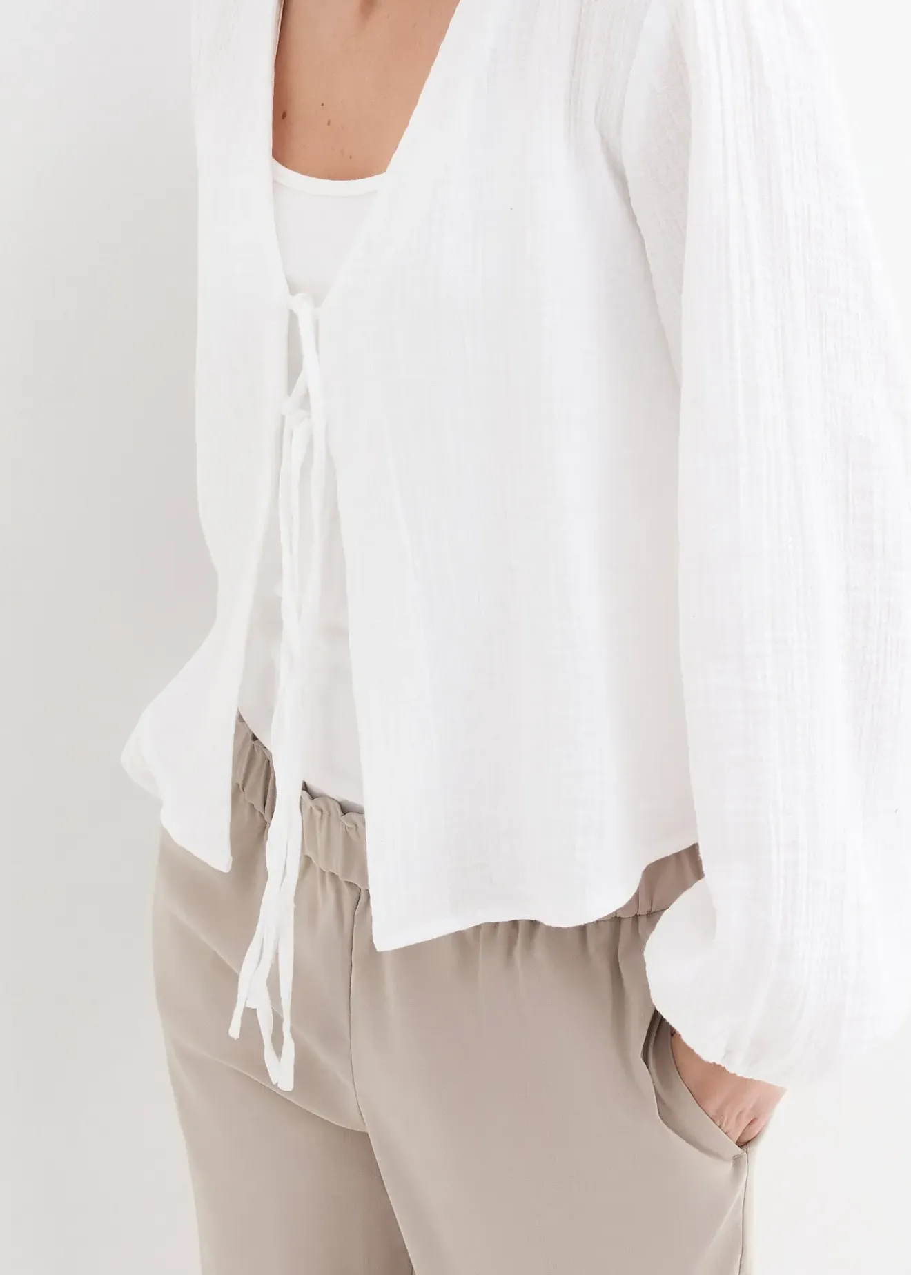 Boléro moderne en gaze de coton avec manches ballon et lien à nouer