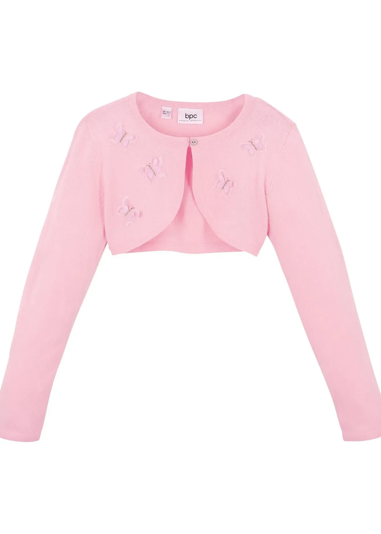 Adorable boléro fille avec papillons brodés pour un look romantique. Ce modèle se porte ouvert ou fermé par un petit bouton. En fine maille douce et agréable sur la peau.