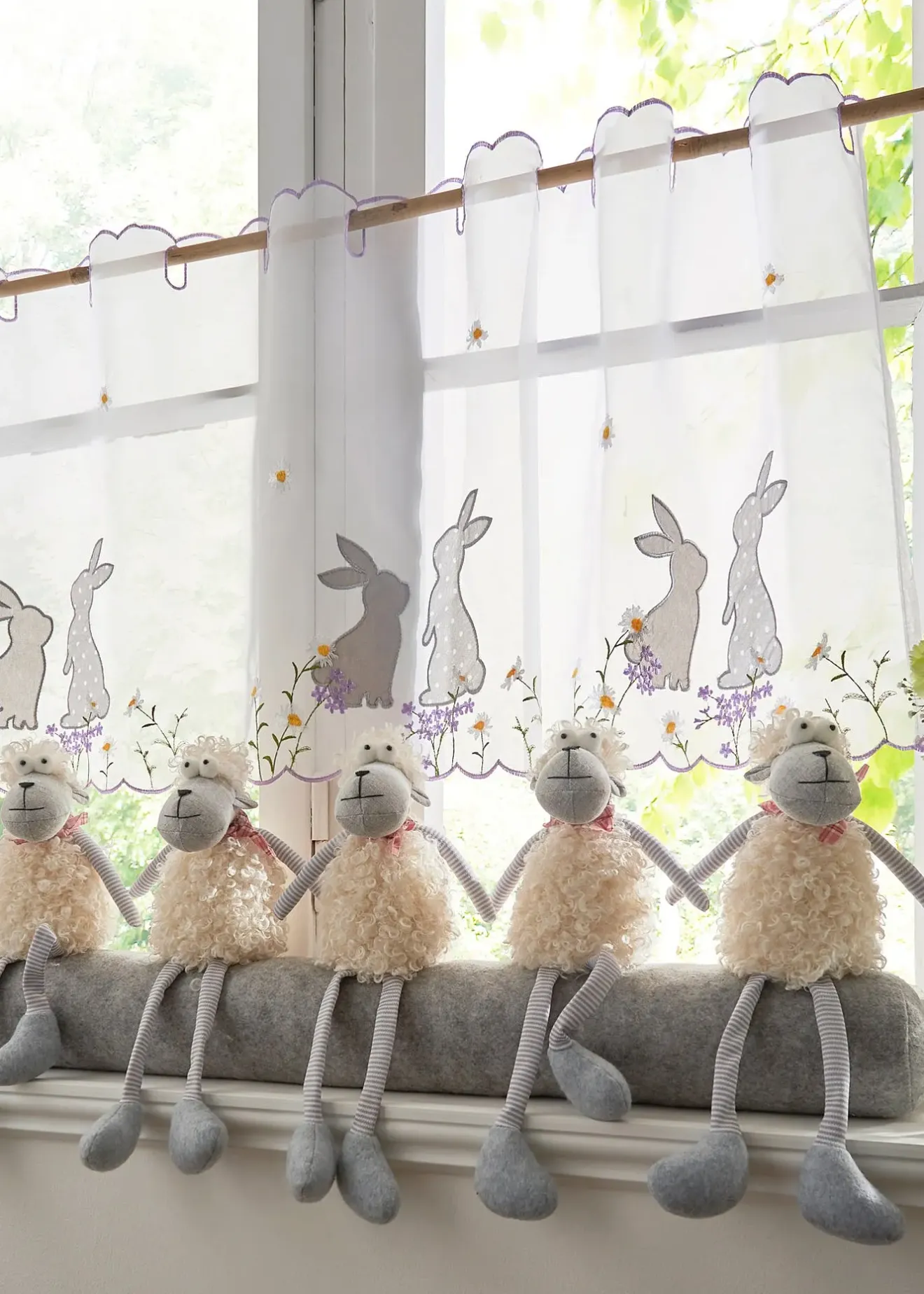 Brise-bise transparent avec adorables lapins brodés et applications. S’installe en quelques gestes pour créer une ambiance de Pâques à votre fenêtre.