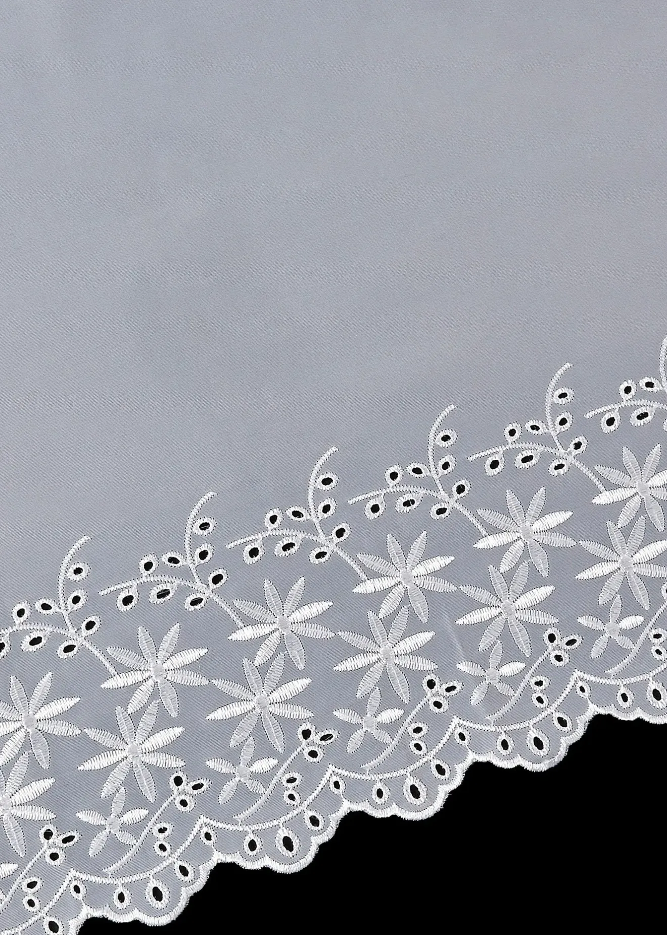 Vitrage en voile transparent avec broderies anglaises et œillets passe-tringle pour diamètre max. 3 cm.