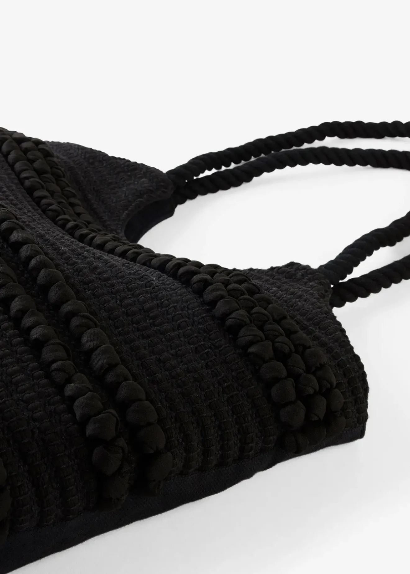 Cabas estival en tissu avec petits détails nœuds. Parfait pour les journées ensoleillées au bord de l’eau. Largeur supérieure env. 35 cm.