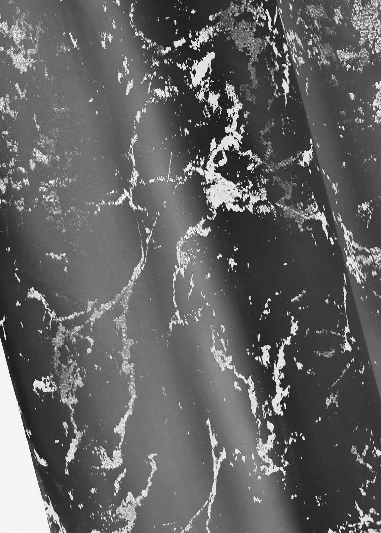 Rideau occultant en tissu lourd avec recto à imprimé marbré brillant. Verso uni. Décoratif le jour, il protège de la lumière la nuit.
