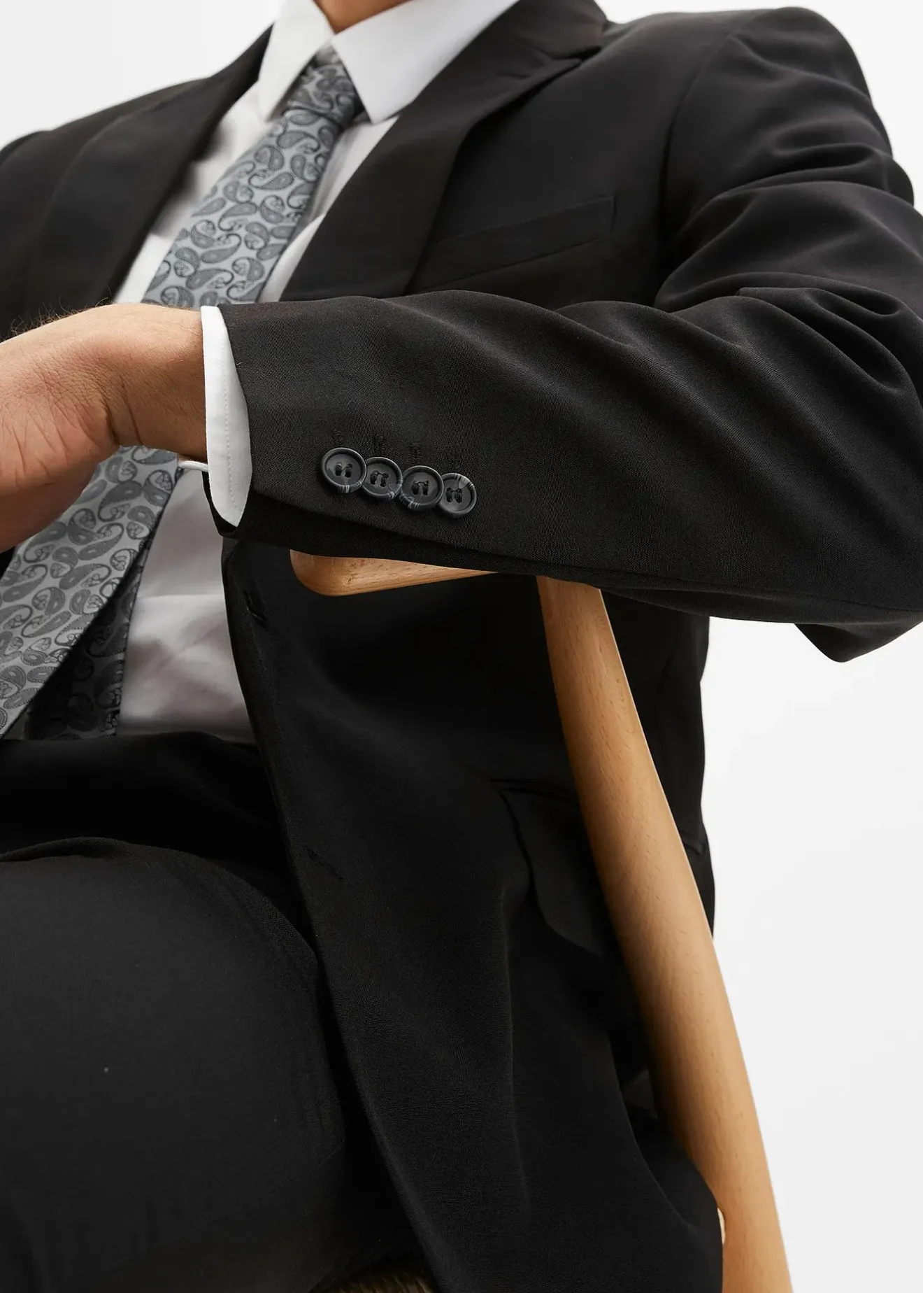 Chemise: bouton, Cravate: bouton, zip, Pantalon: bouton, zip, Veste de costume: boutons