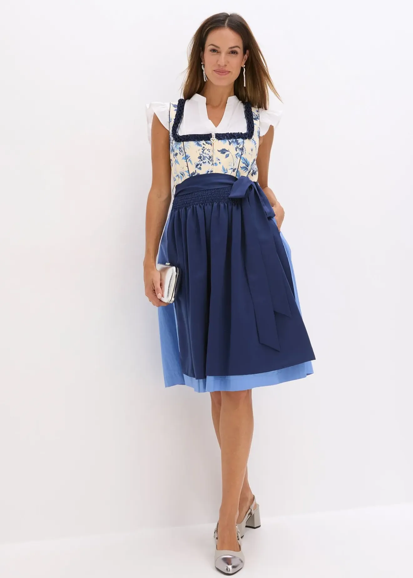 Dirndl moderne et féminin avec une bordure et un tablier en satin brillant. Imprimé unique.