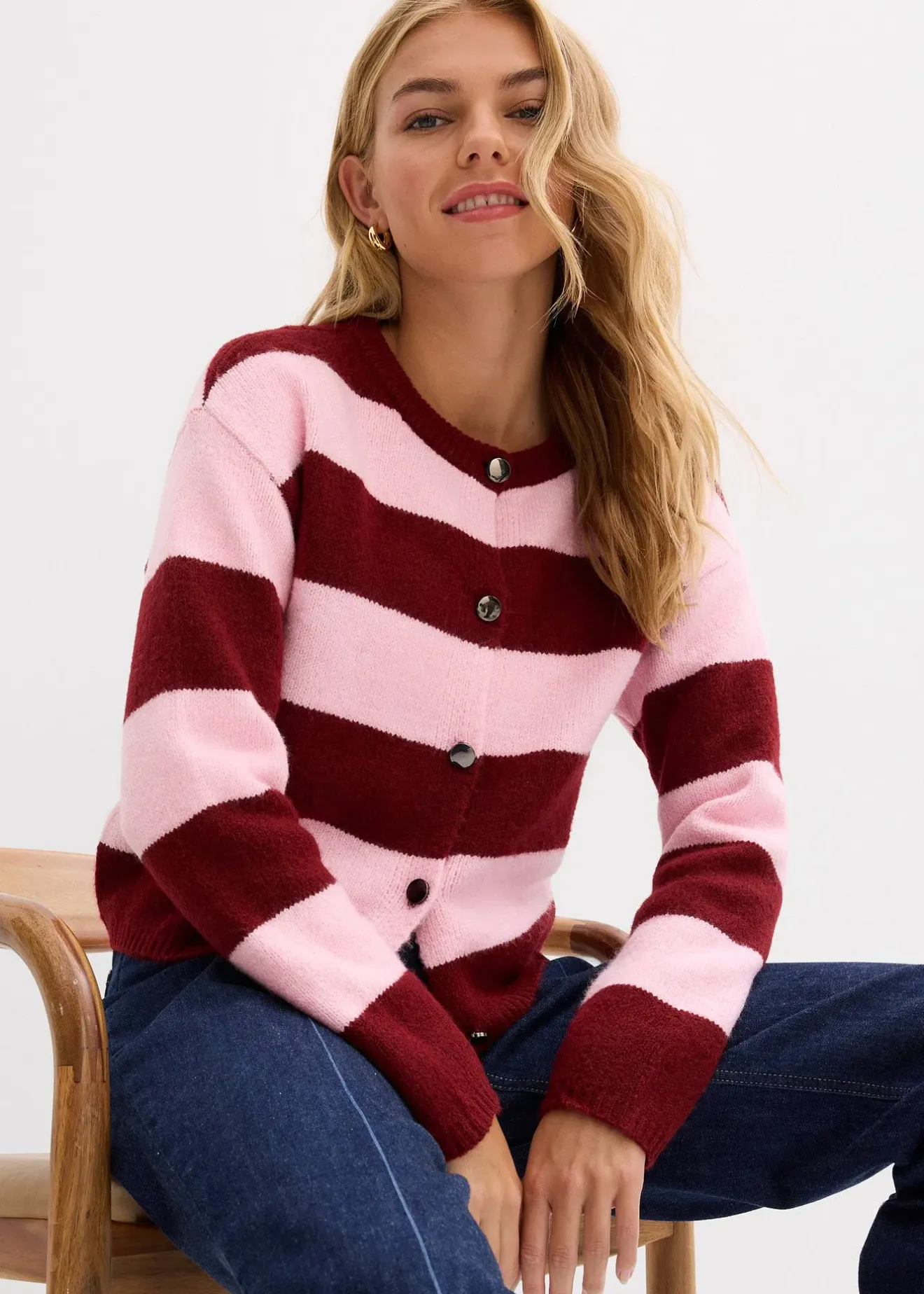 Gilet court et boutonné en fine maille rayée