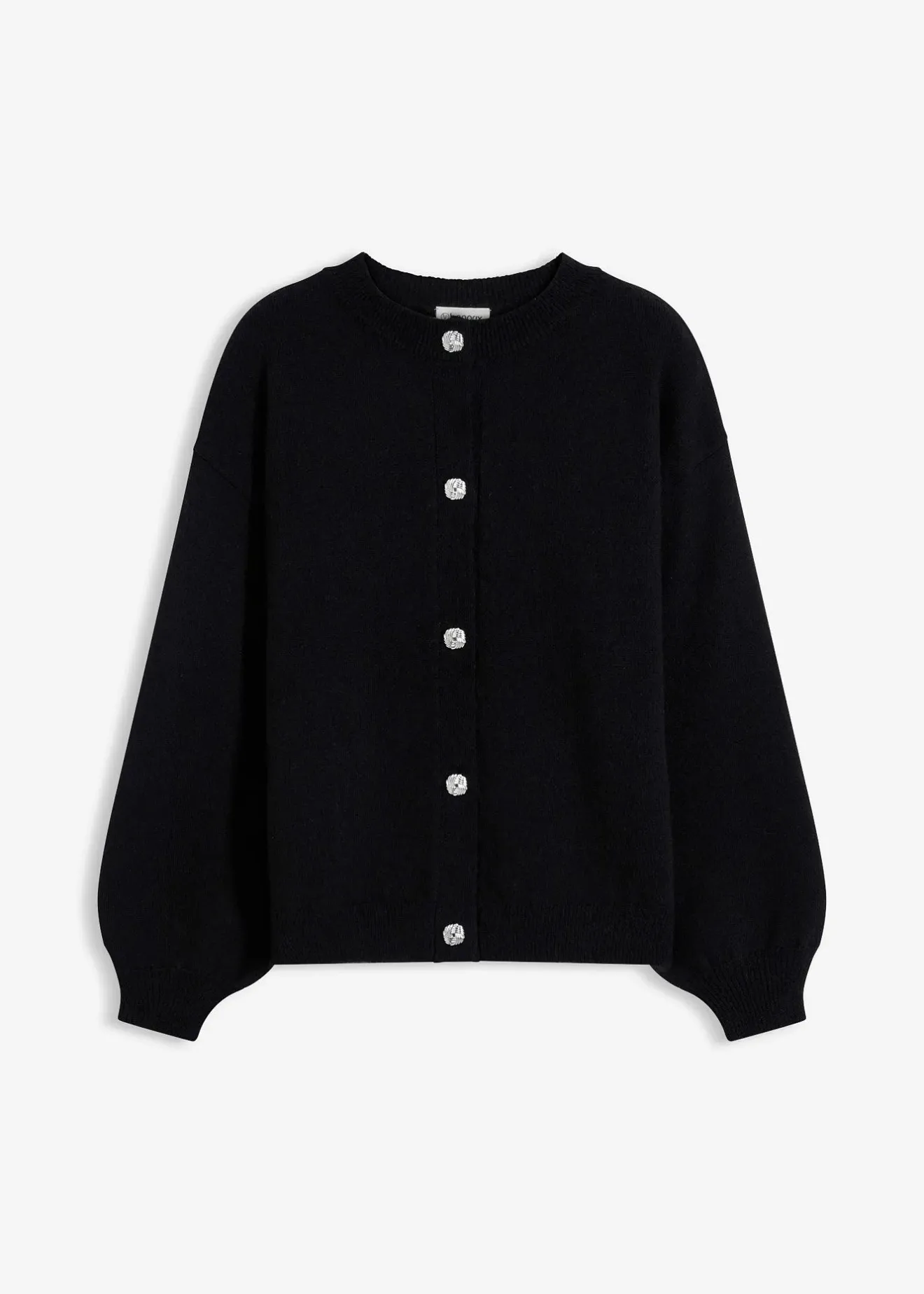 Gilet en maille unie à col rond et longues manches ballon. Fermeture devant par des boutons métalliques décoratifs