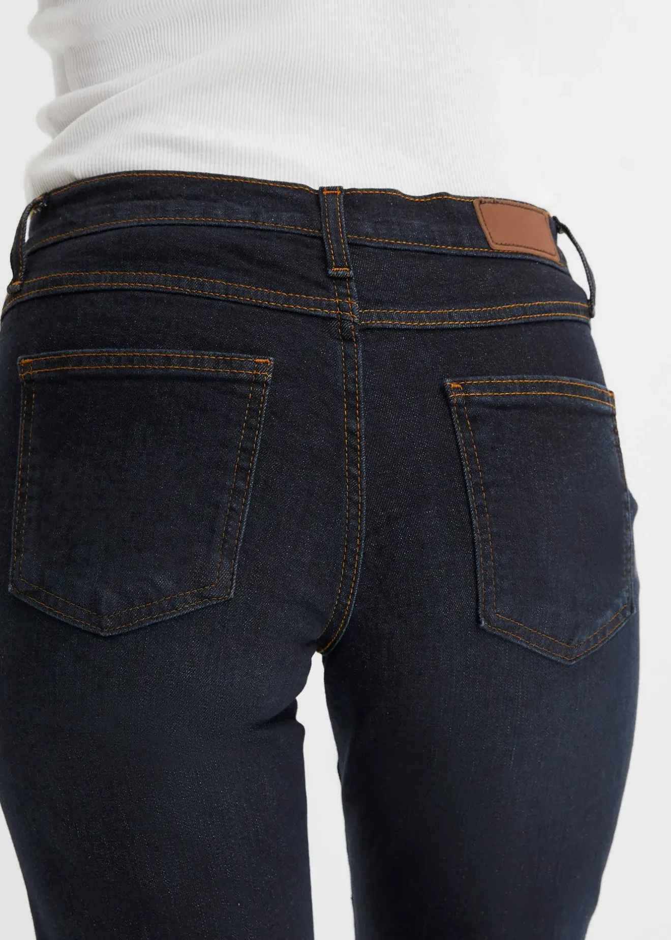Jean extensible de la marque John Baner avec coutures avancées devant pour un effet amincissant. Taille mi-haute, style 5 poches, ampleur cuisses classique, jambes droites. Modèle facile à combiner avec de jolis hauts et des chaussures à talons.