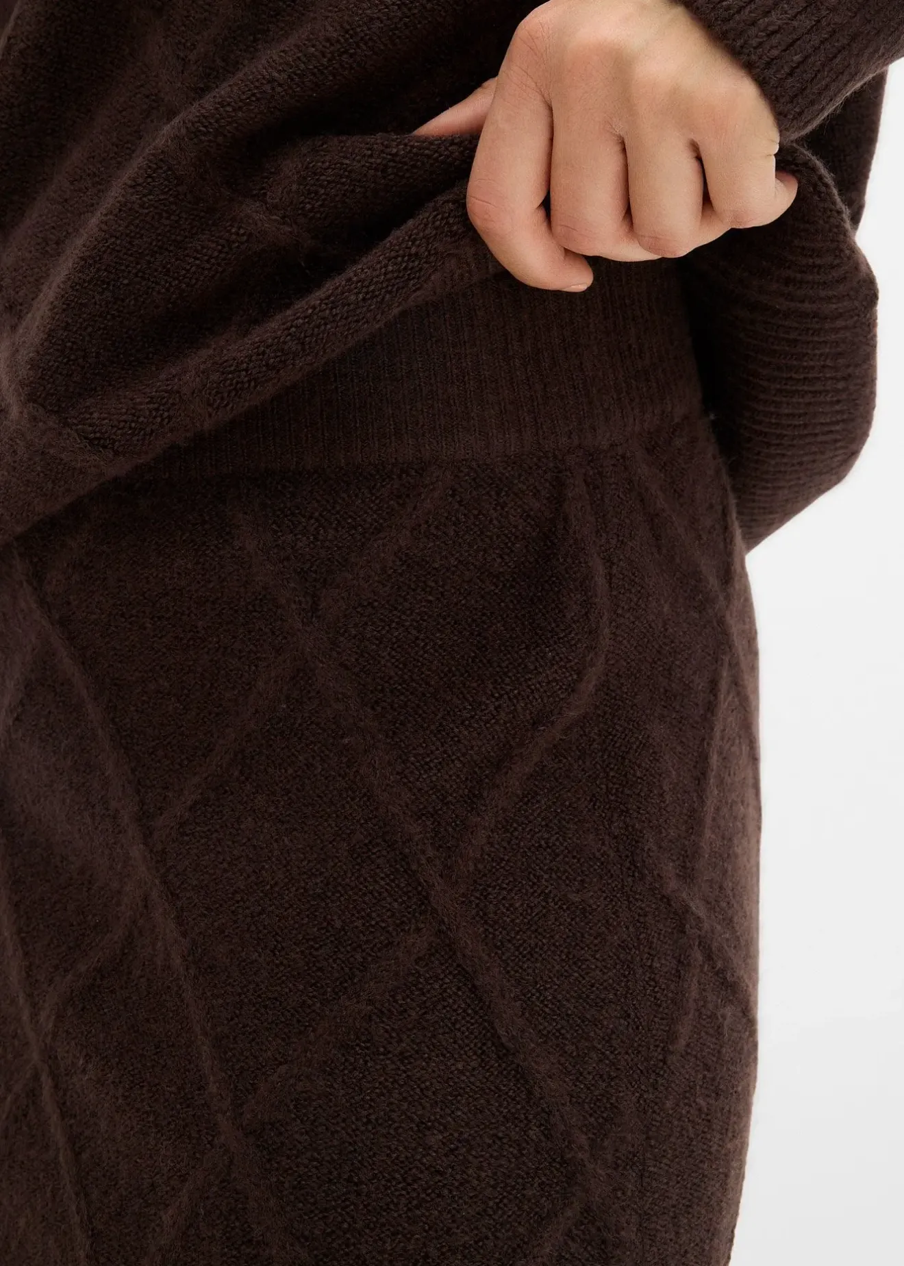 Jupe taille haute décontractée en maille torsadée. Finitions côtelées à la base et à la taille.