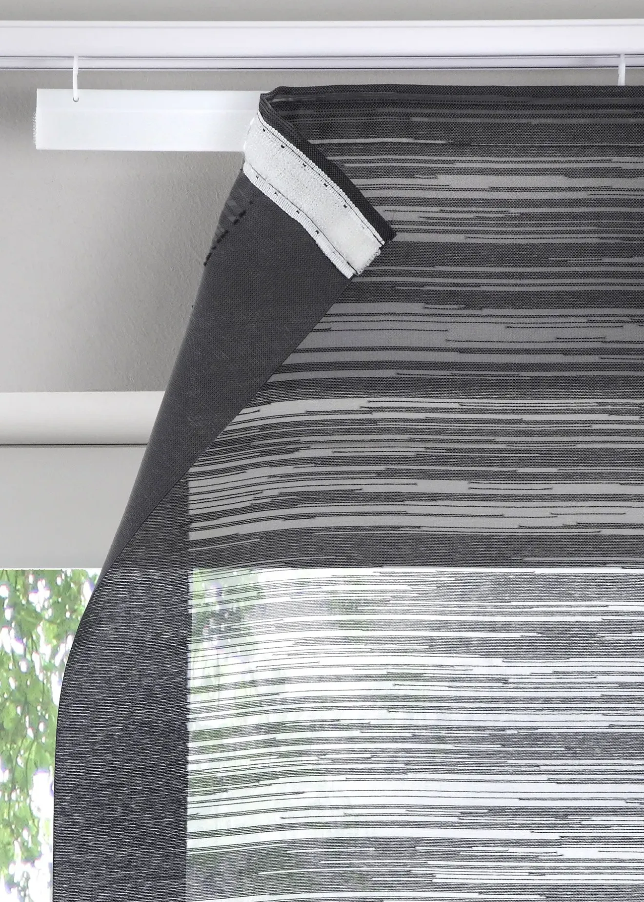 Panneau coulissant moderne en matière semi-transparente. Motif rayé réalisé selon la technique du broché avec une finition effilochée tendance. Différents coloris au choix.