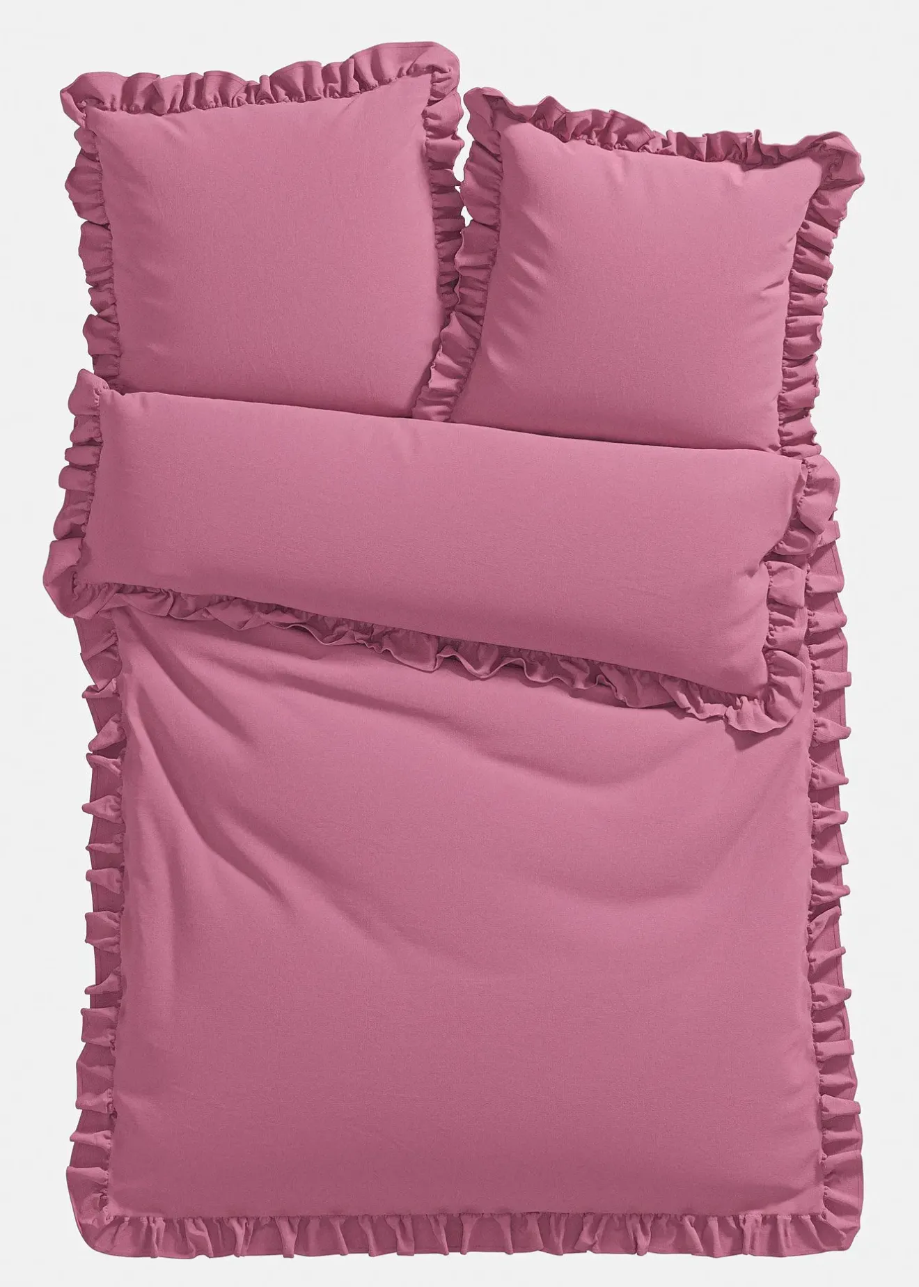 Parure de lit avec volants sur la housse de couette et les taies d’oreiller.