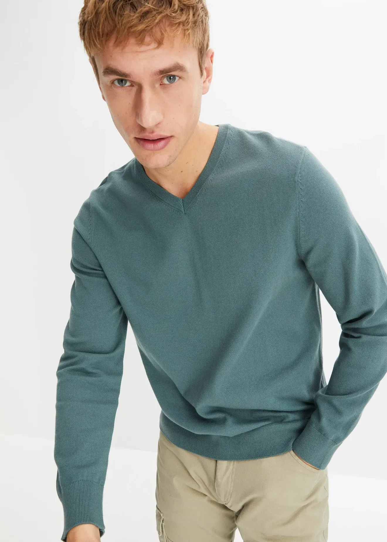 Pull homme classique en fine maille de coton majoritaire avec col en V et finitions côtelées