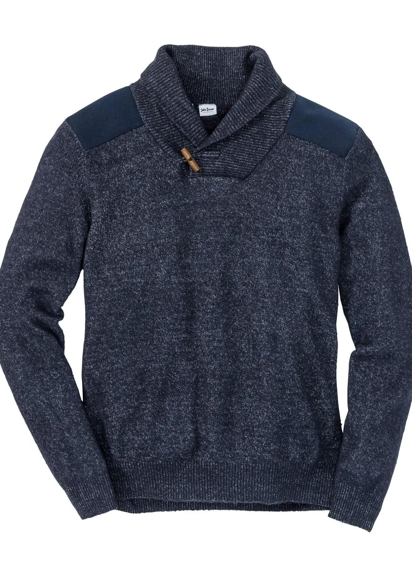 Pull Regular ample et sportif à col châle de John Baner. Empiècements contrastés aux épaules, motif côtelé. grand bouton brandebourg à l’encolure.