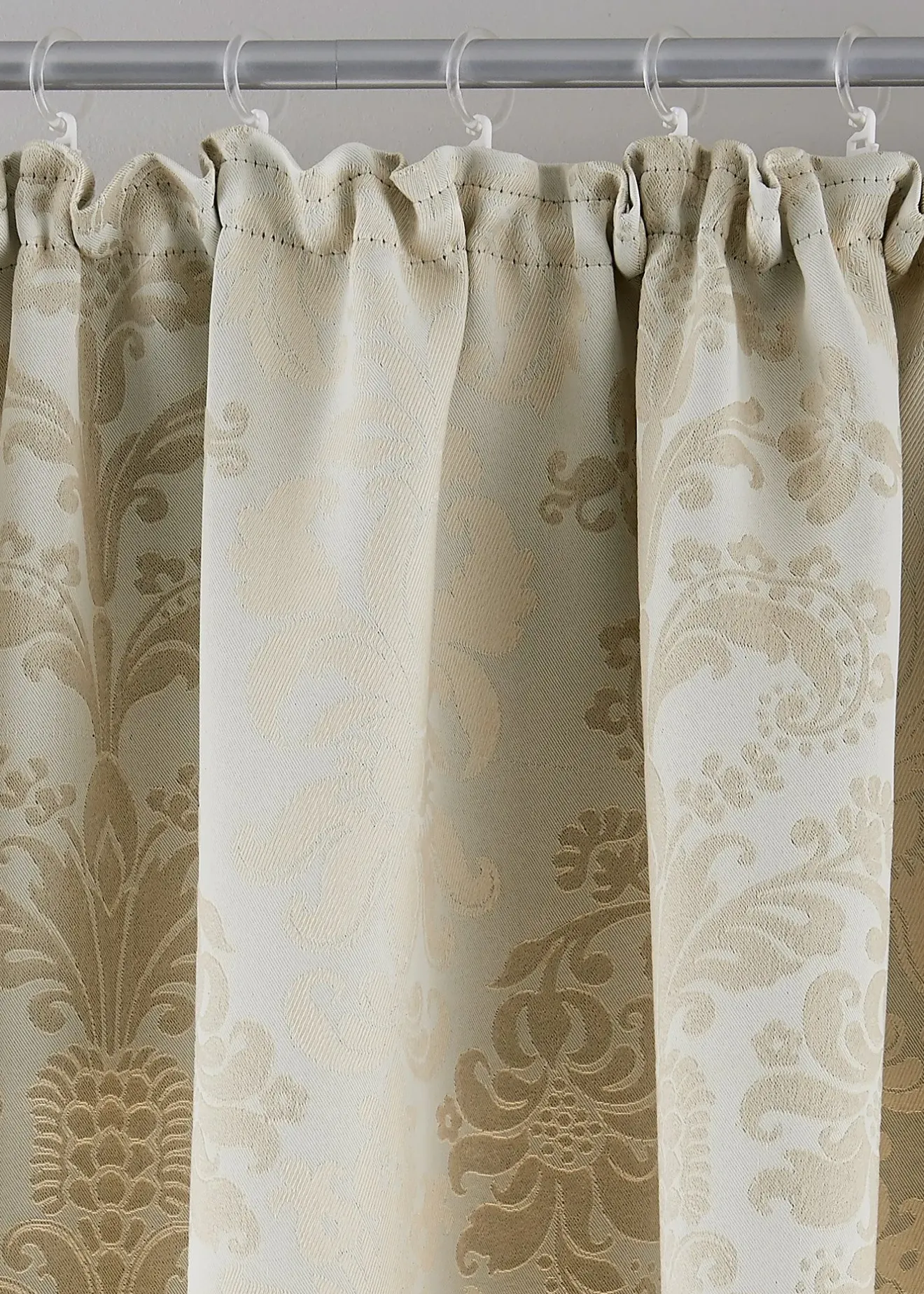 Rideau occultant permettant des économies d’énergie grâce à son tissu épais : bloque les rayons chauds du soleil ou les courants d’air froid.Motif ornemental raffiné sur le devant et le dos, car procédé jacquard de qualité. Double largeur (270 cm) travaillée avec une couture centrale.