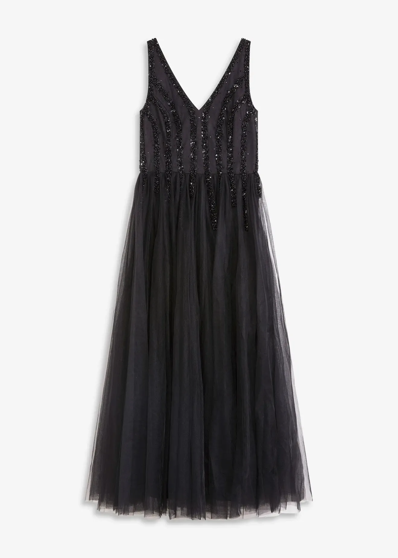 Longue robe de soirée moderne et féminine en tulle fin avec une jupe évasée et un haut orné de sequins brodés
