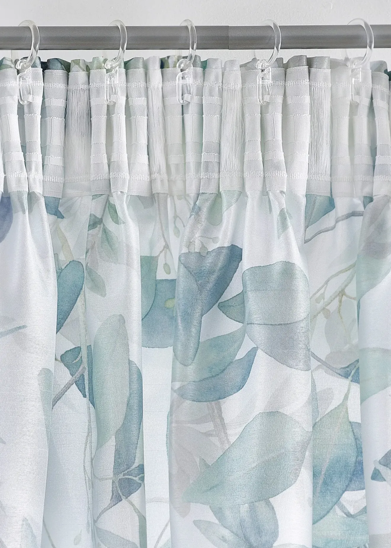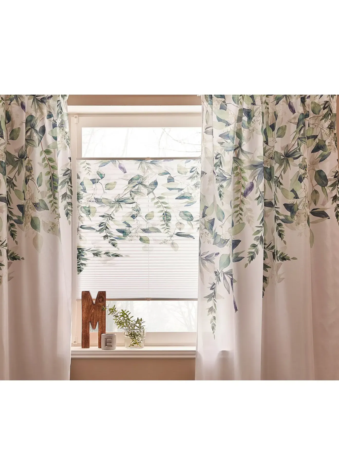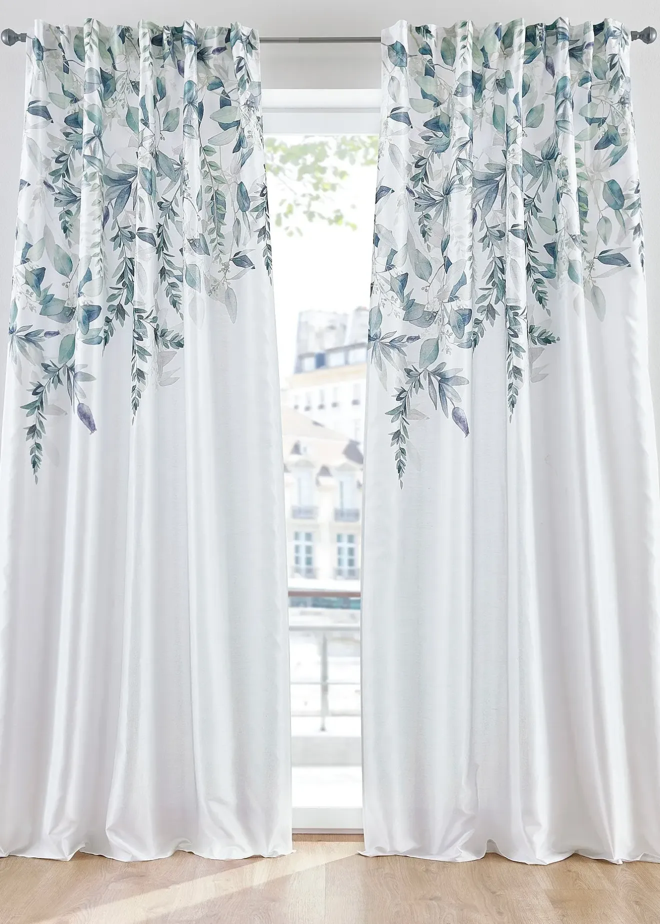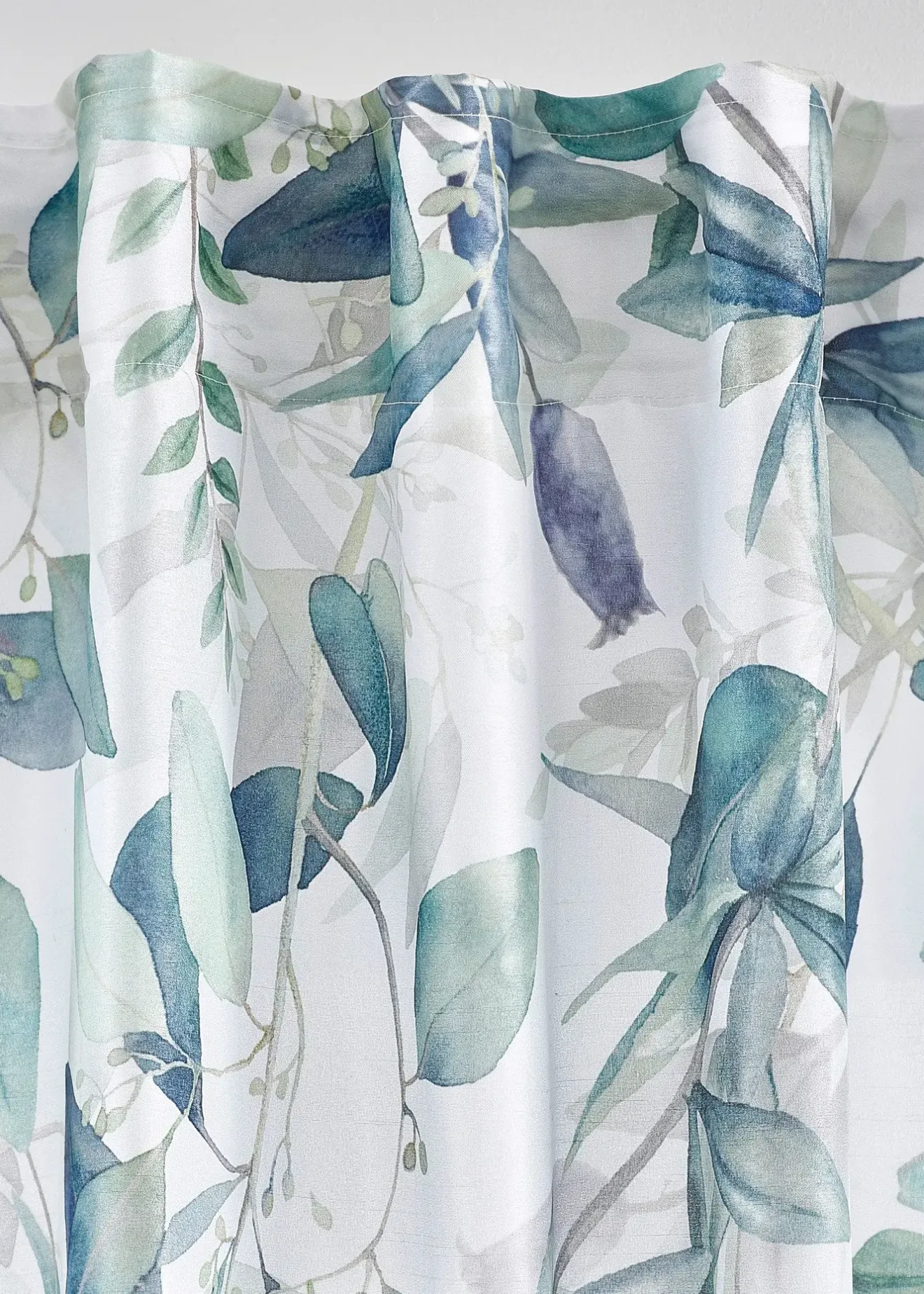 Rideau élégant avec un magnifique imprimé végétal du haut vers le bas. Belle matière effet soie, légèrement brillante pour illuminer votre fenêtre.