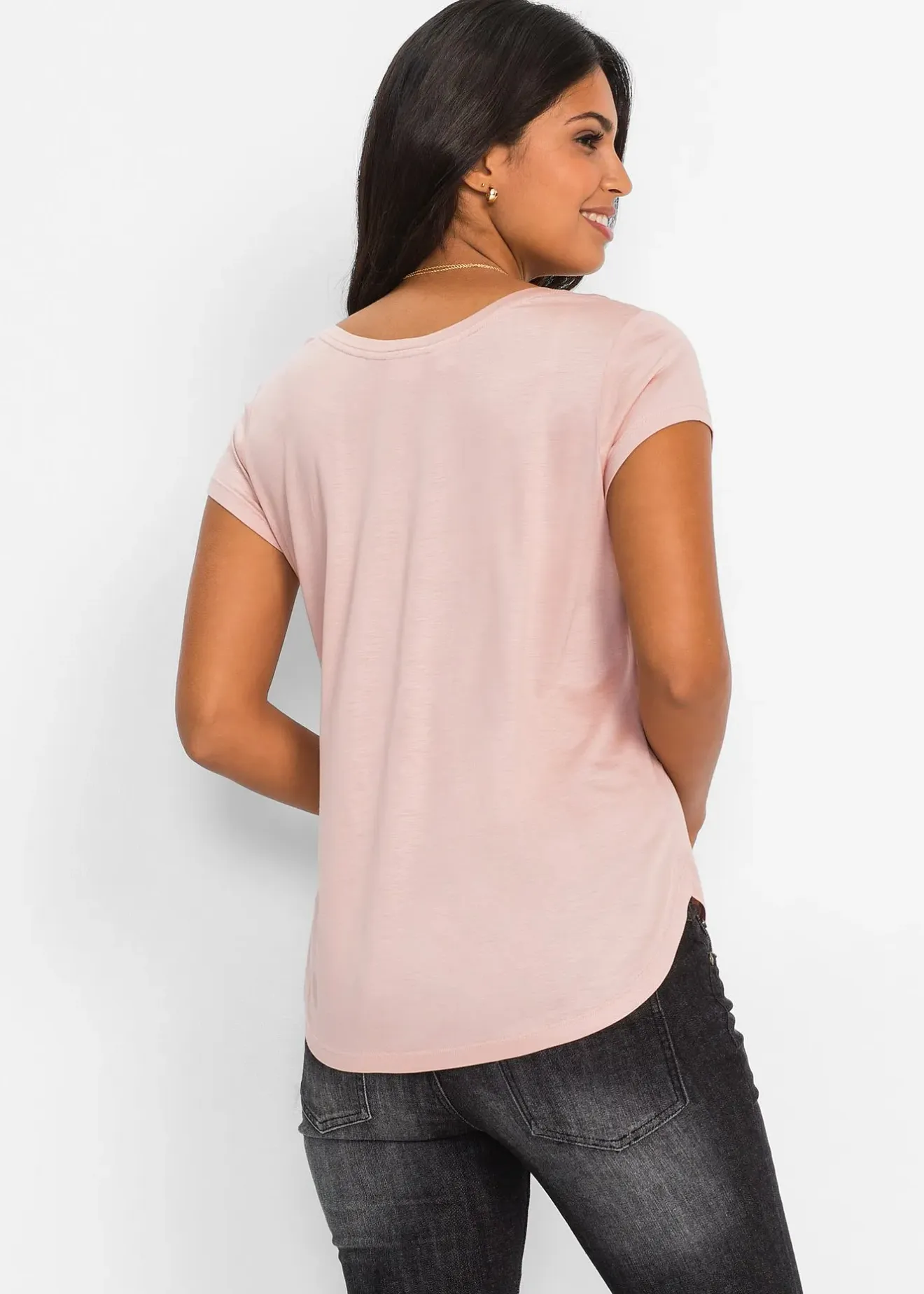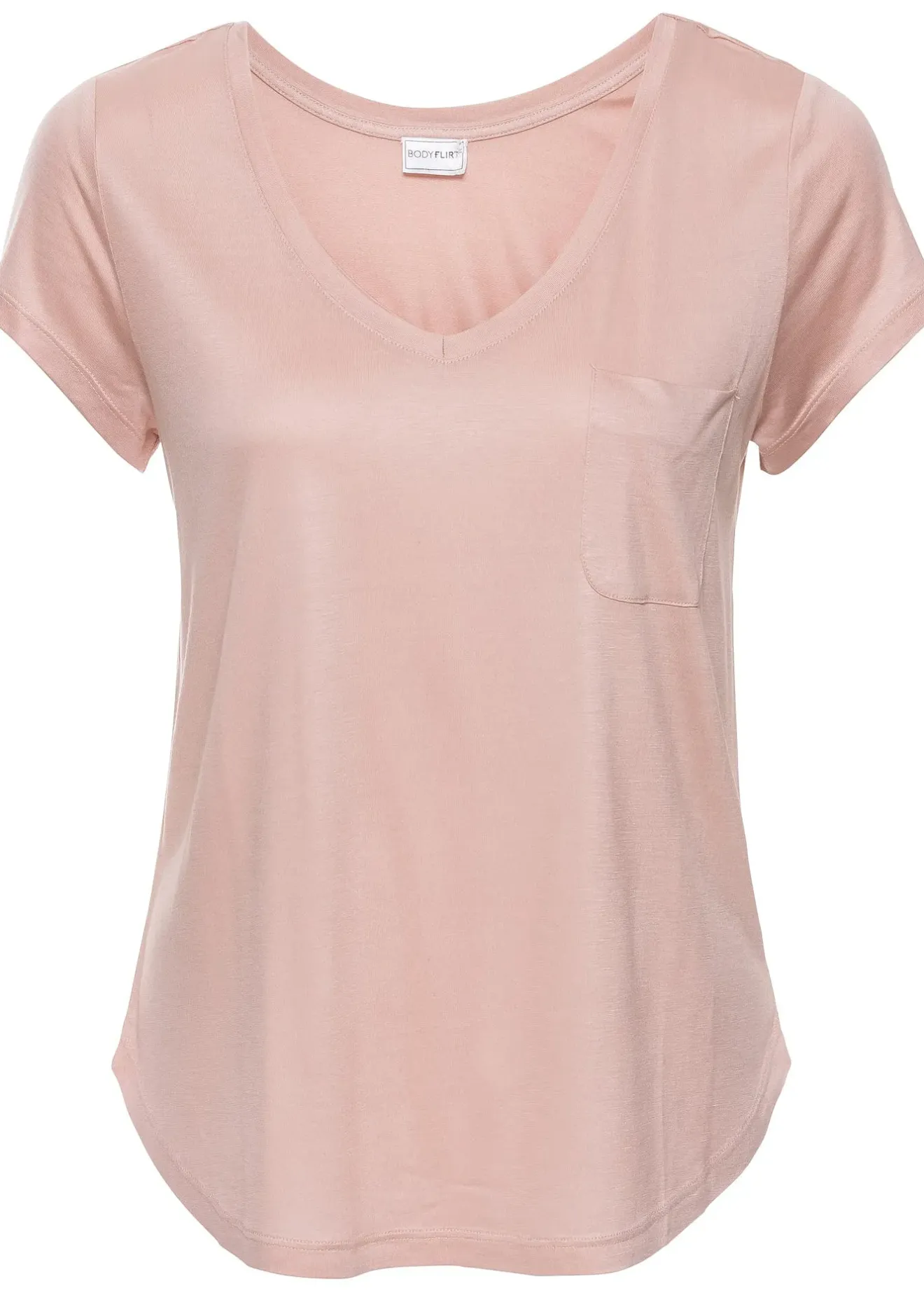La coupe ample flatteuse et la base arrondie donnent à ce T-shirt de BODYFLIRT une belle allure. La poche plaquée sur la poitrine ajoute une touche décorative. Le tissu doux et légèrement brillant lui donne un look raffiné. L’encolure en V met parfaitement en valeur le décolleté. Ce modèle à manches courtes s’associe facilement pour créer des tenues féminines et stylées.