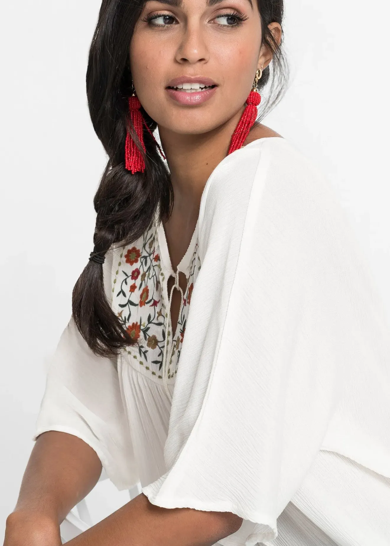 La broderie florale et les épaules découpées attirent l’œil sur cette blouse. Encolure ronde agrémentée de liens à nouer. Manches demi-longues. Long. env. 66 cm.