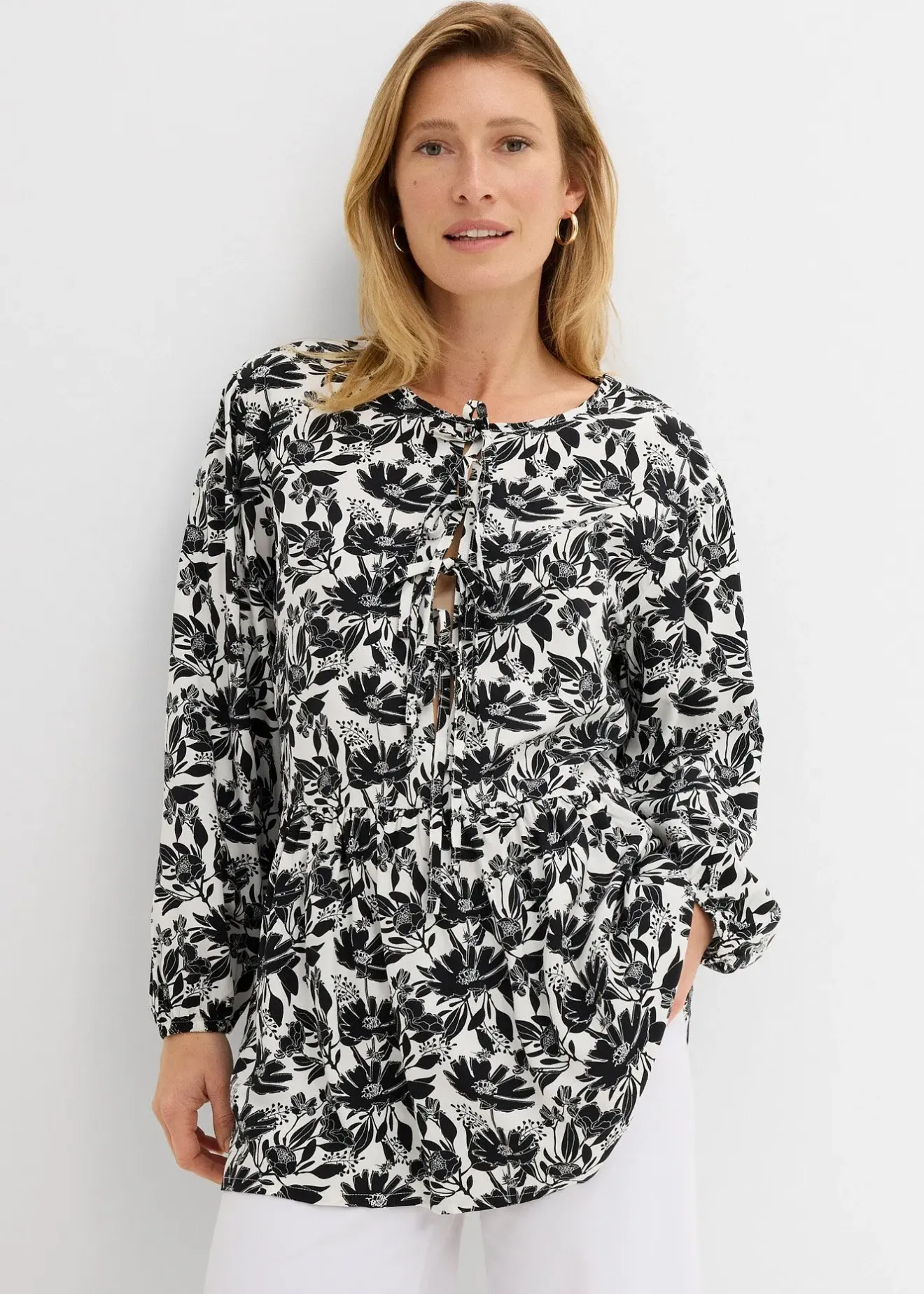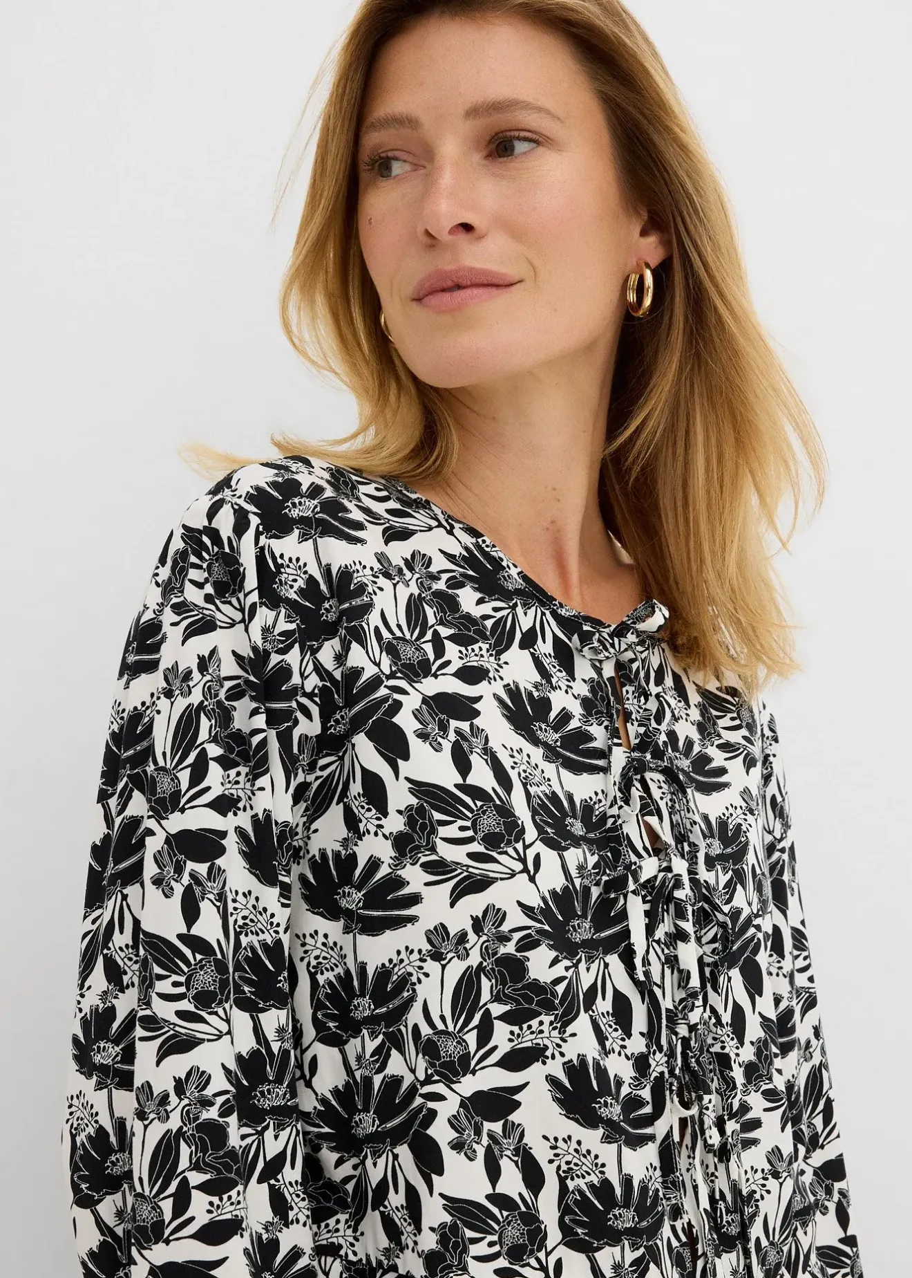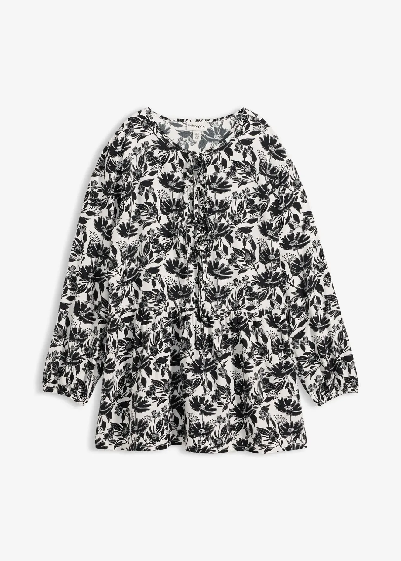 Tunique trapèze à épaules légèrement descendues, col rond et trois liens à nouer.