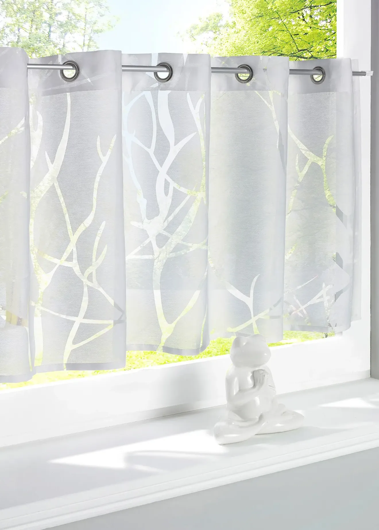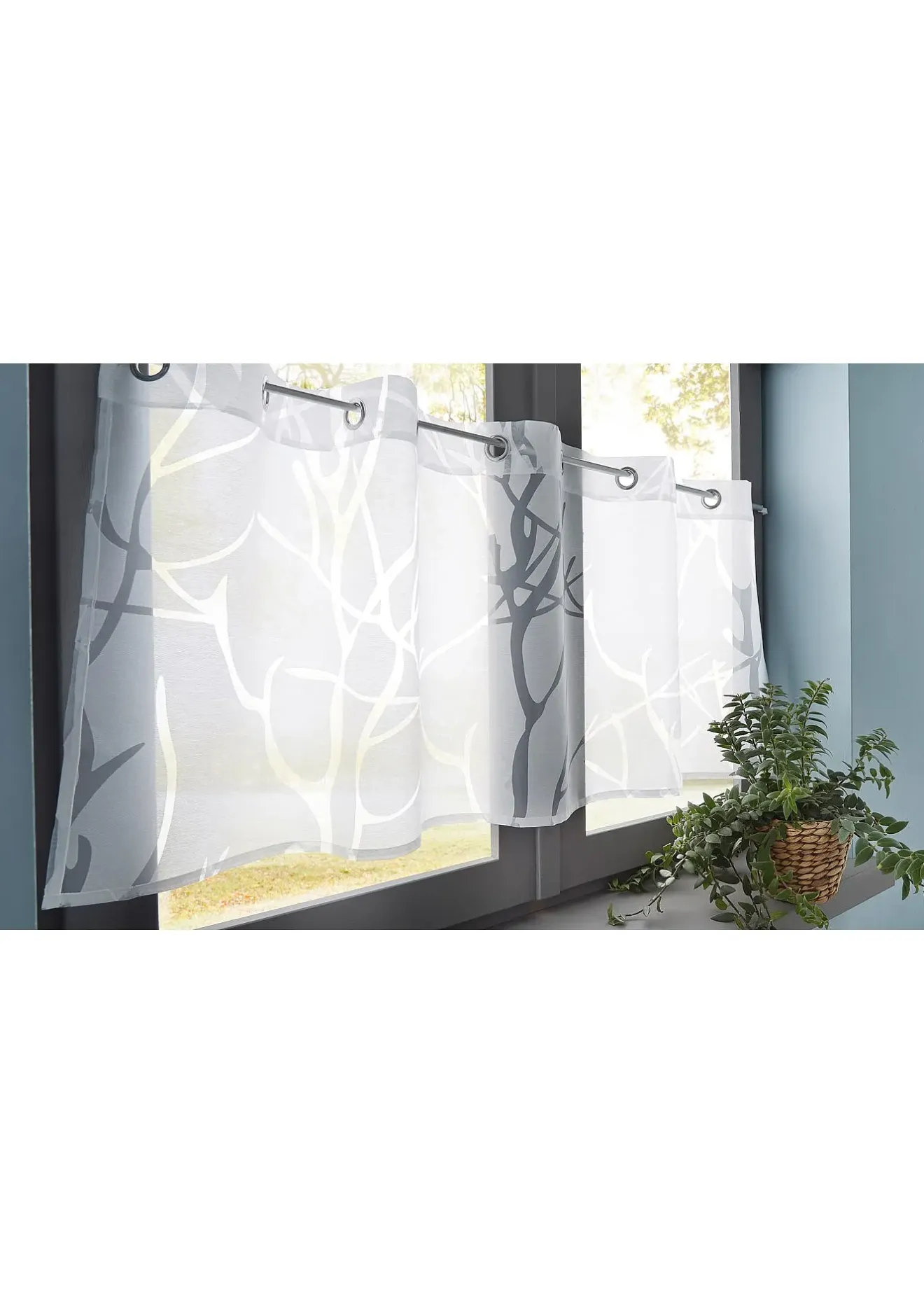 Le motif dévoré donne un joli effet et un résultat très authentique. Ce brise-bise de belle qualité en matière mélangée trouve idéalement sa place dans la cuisine ou la salle à manger, la lumière du jour créant une belle ambiance dans la pièce.