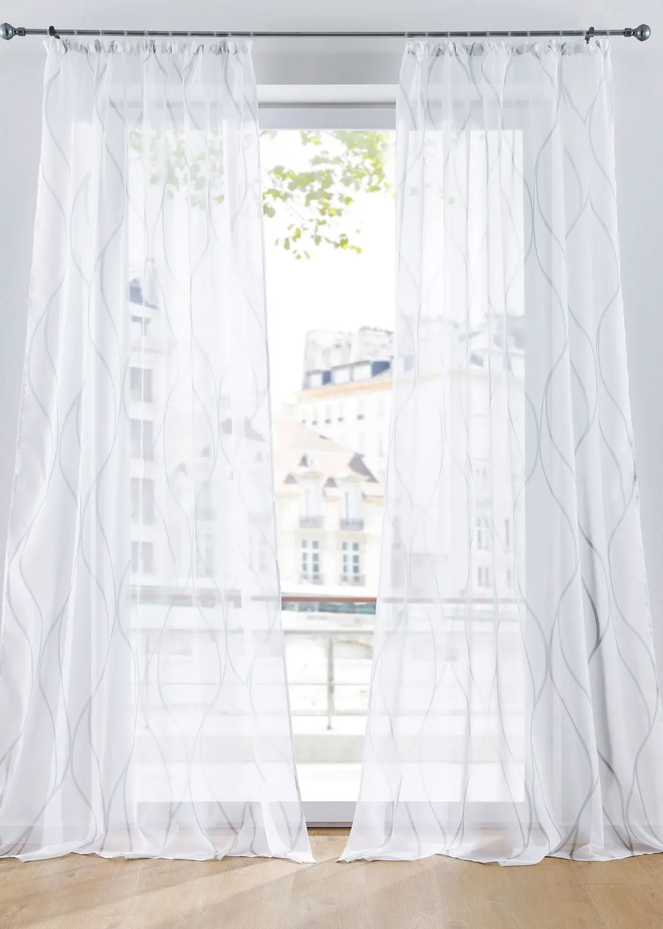 Voilage blanc et transparent avec un imprimé gris moderne pour un look versatile. Tissu polyester fin, léger et facile d’entretien au tombé fluide.