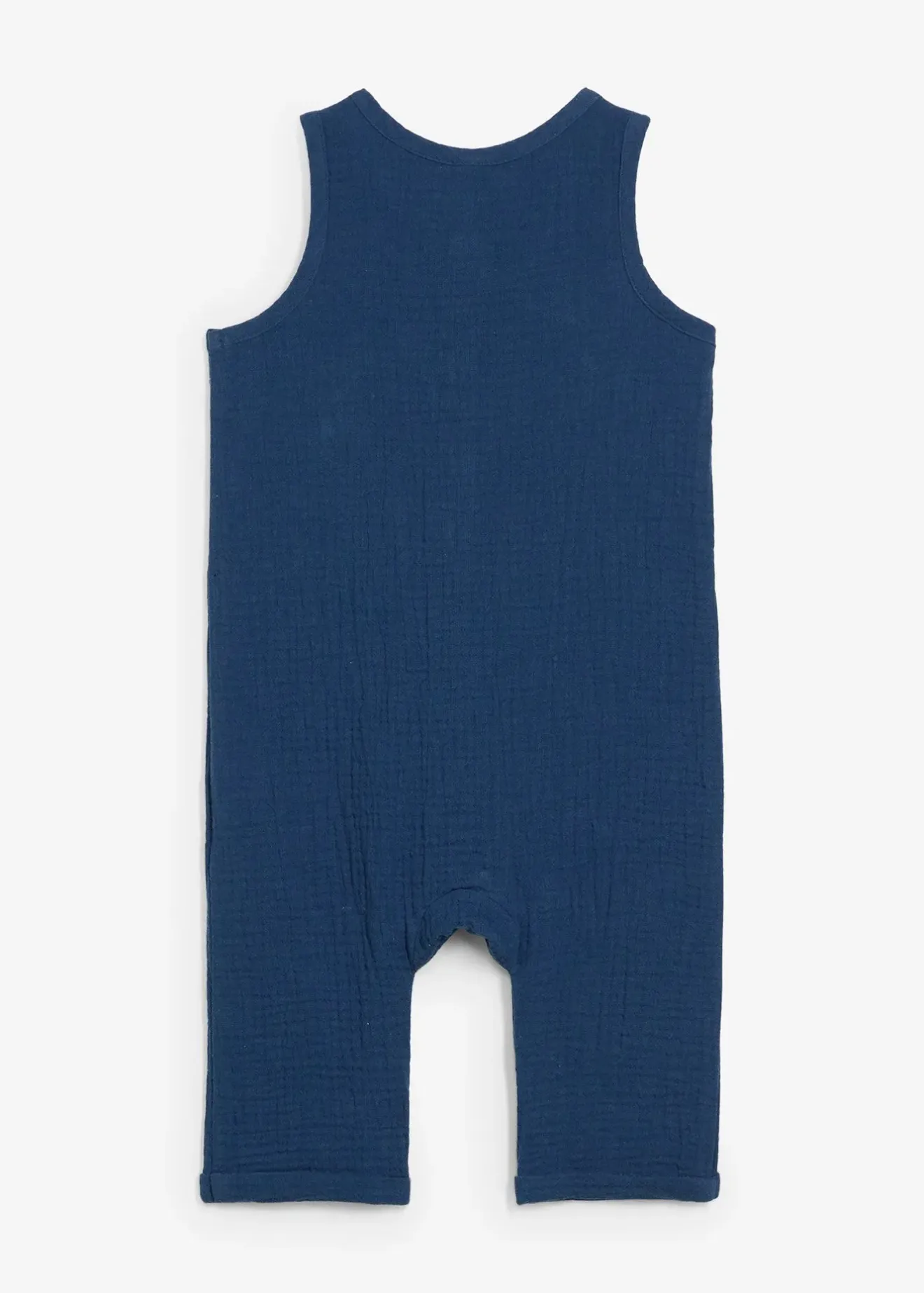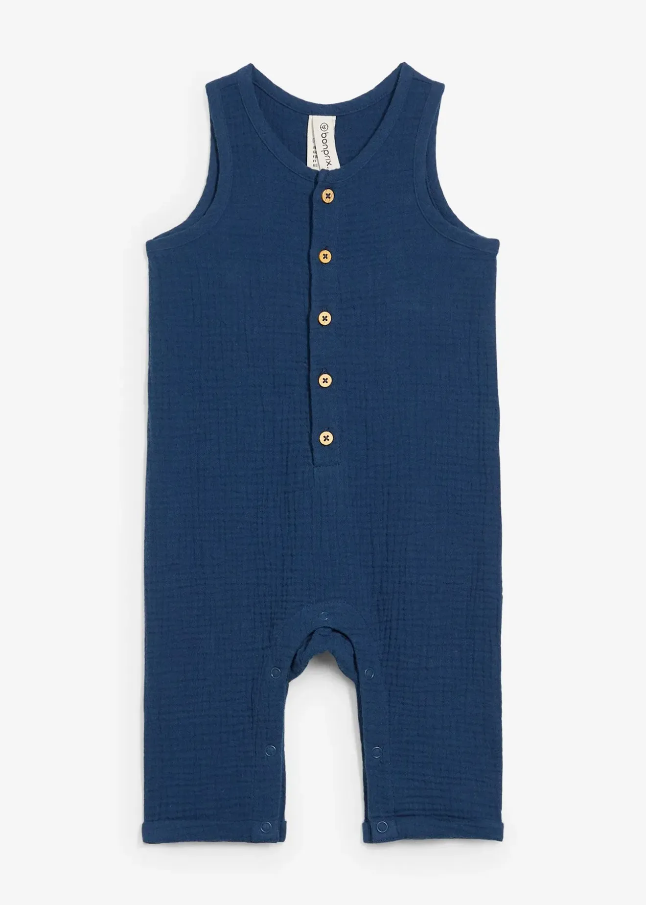 Combinaison bébé sans manches en gaze de coton, idéale pour l’été. Boutons aspect bois et coupe ample pour une grande liberté de mouvement.