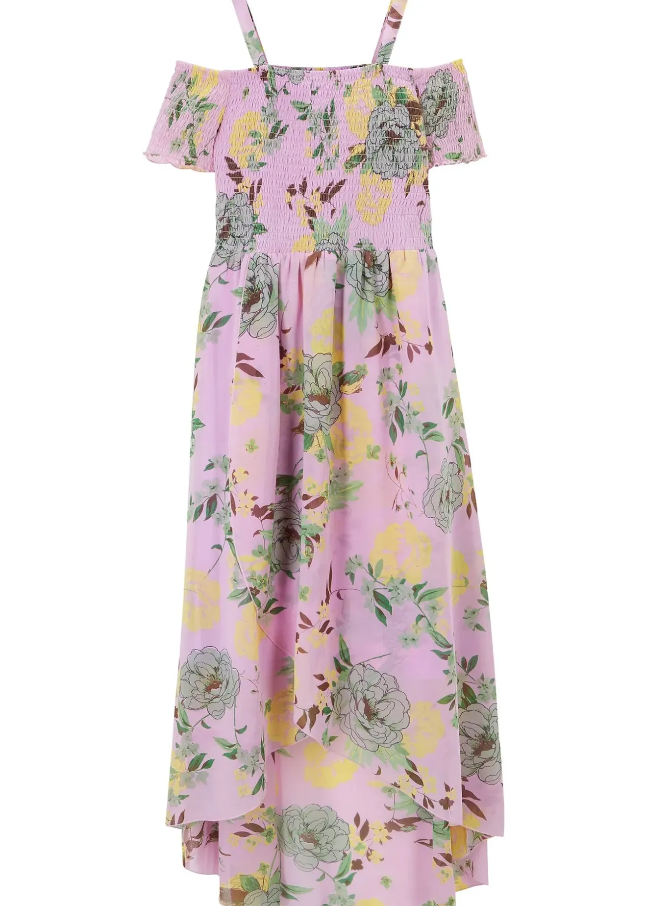 Jolie robe à motif floral, épaules découvertes et empiècement jupe longue. Cette robe avec buste smocké est une pièce phare pour toutes les petites fashionistas.