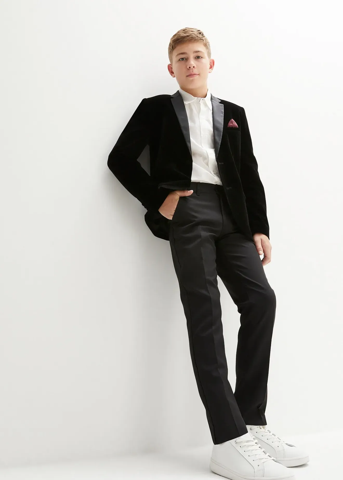 Ensemble élégant pour garçon composé d’un costume, d’une chemise et d’une cravate. À la fois chic et cool pour les occasions spéciales comme les fêtes de famille ! Pantalon avec passants de ceinture et taille réglable fermée par une agrafe et un bouton. Veste à trois boutons.
