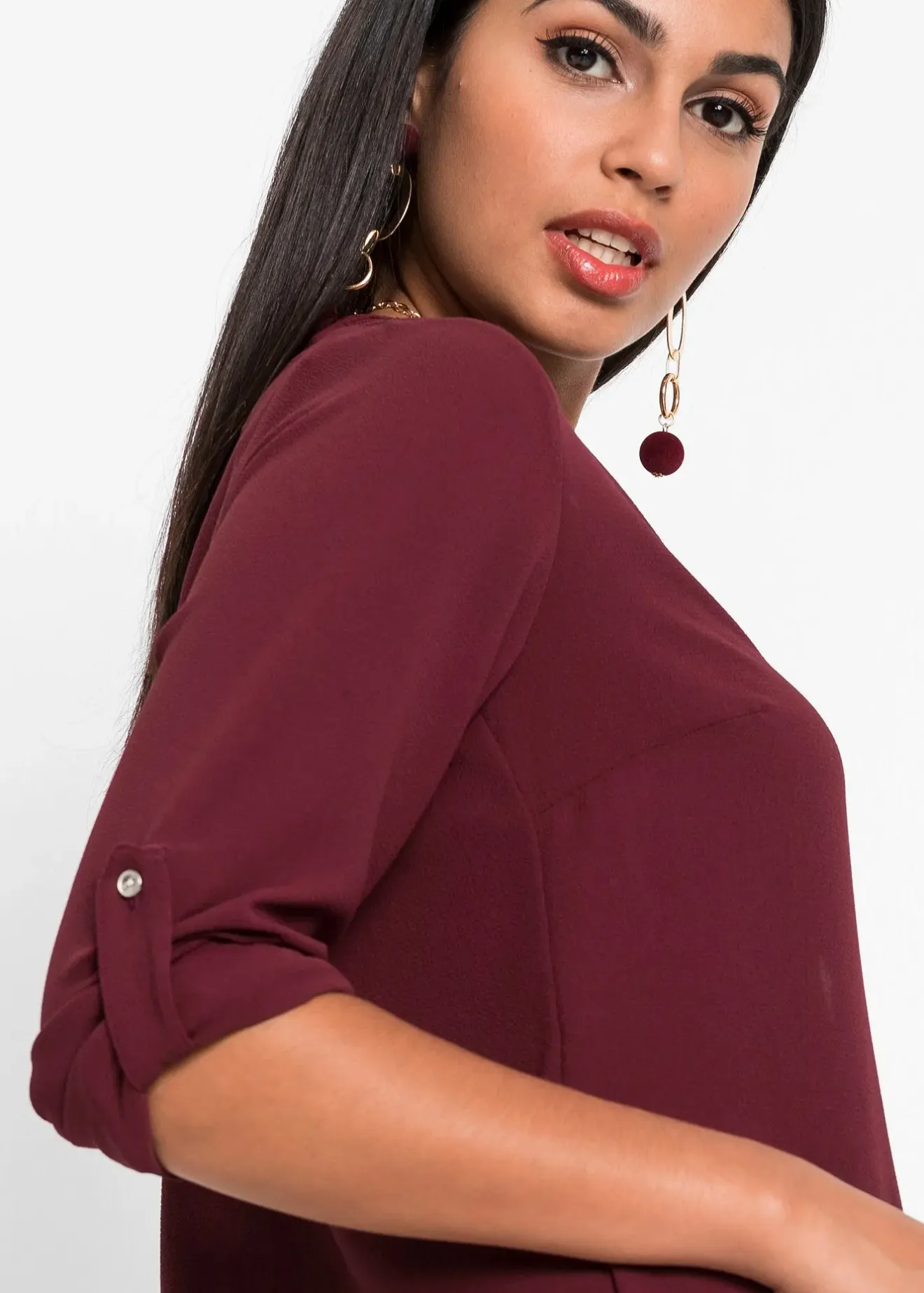 Chemisier moderne à manches longues avec un décolleté plongeant en V, patte de boutonnage invisible et tissu crêpe légèrement transparent. Les manches se retroussent avec style et se fixent par une patte boutonnée. Long. env. 74 cm.