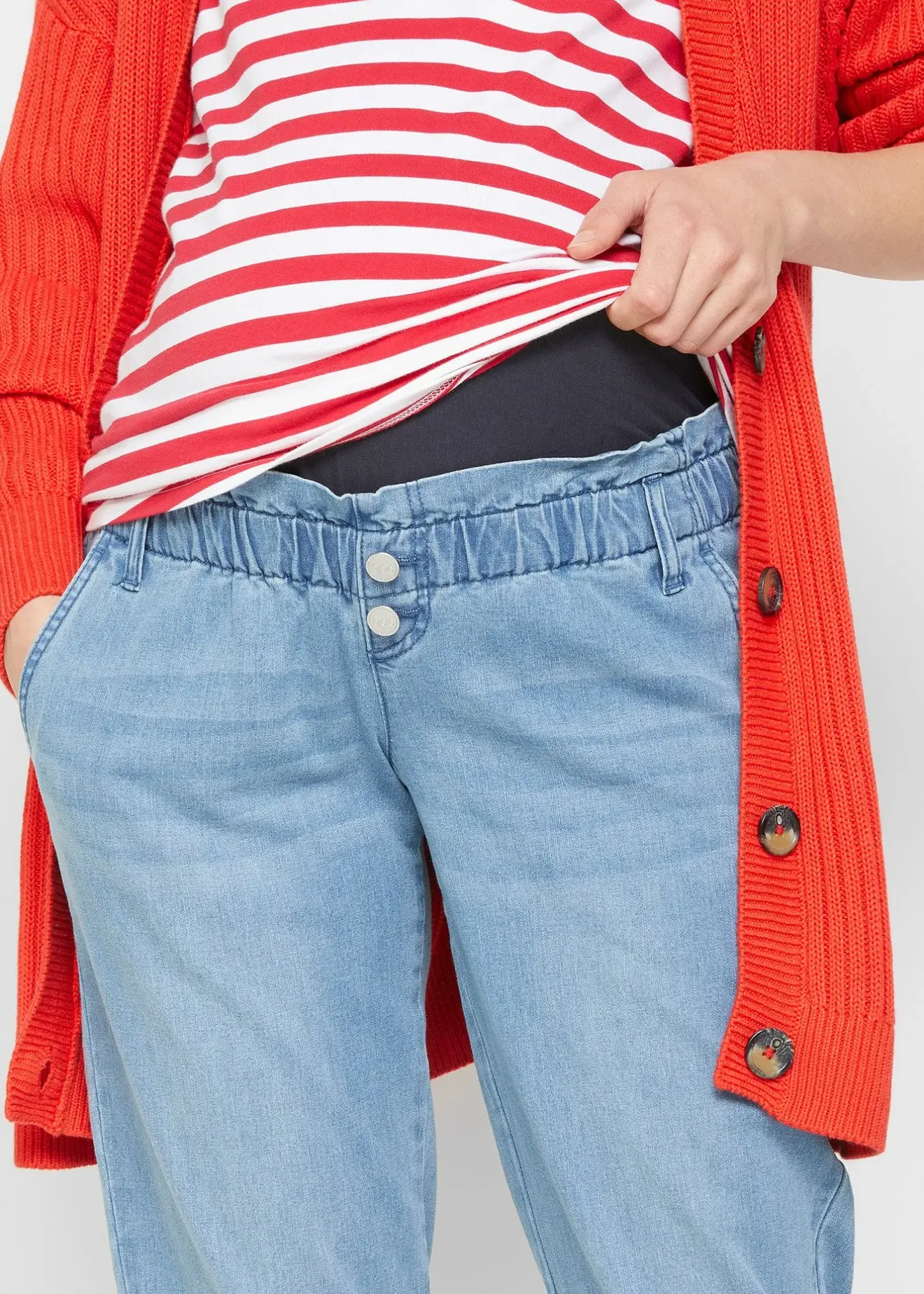 Jean de grossesse 4 poches longueur chevilles en toile de coton extensible pour plus de confort. Taille basse et élastique pour épouse le ventre qui s’arrondit au fil de la grossesse. Coupe ample sur les cuisses puis fuselée sur les jambes. Large bandeau en jersey monté pour un confort optimal au niveau du ventre.