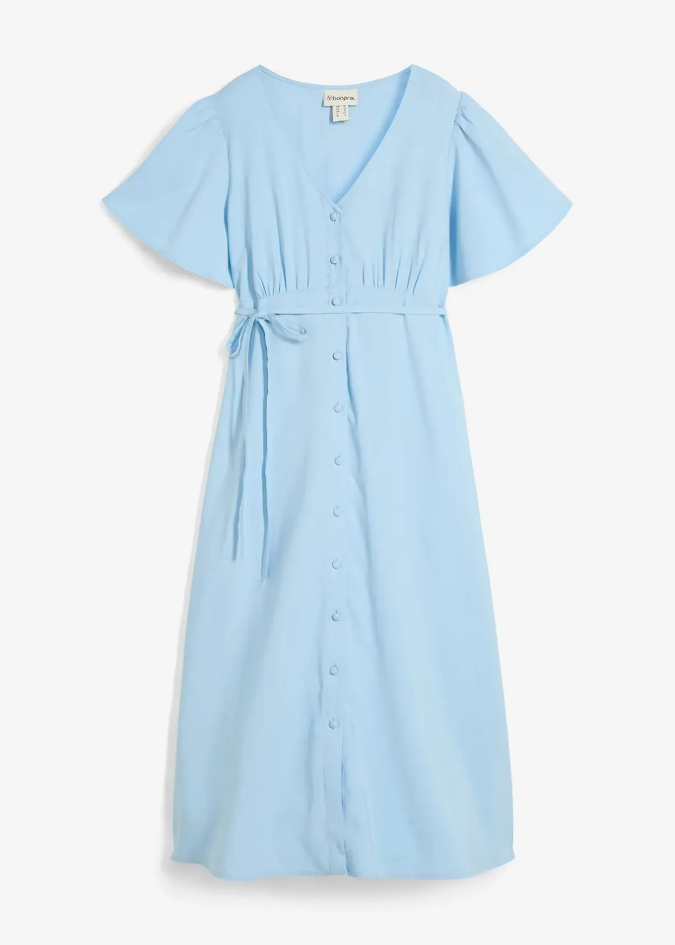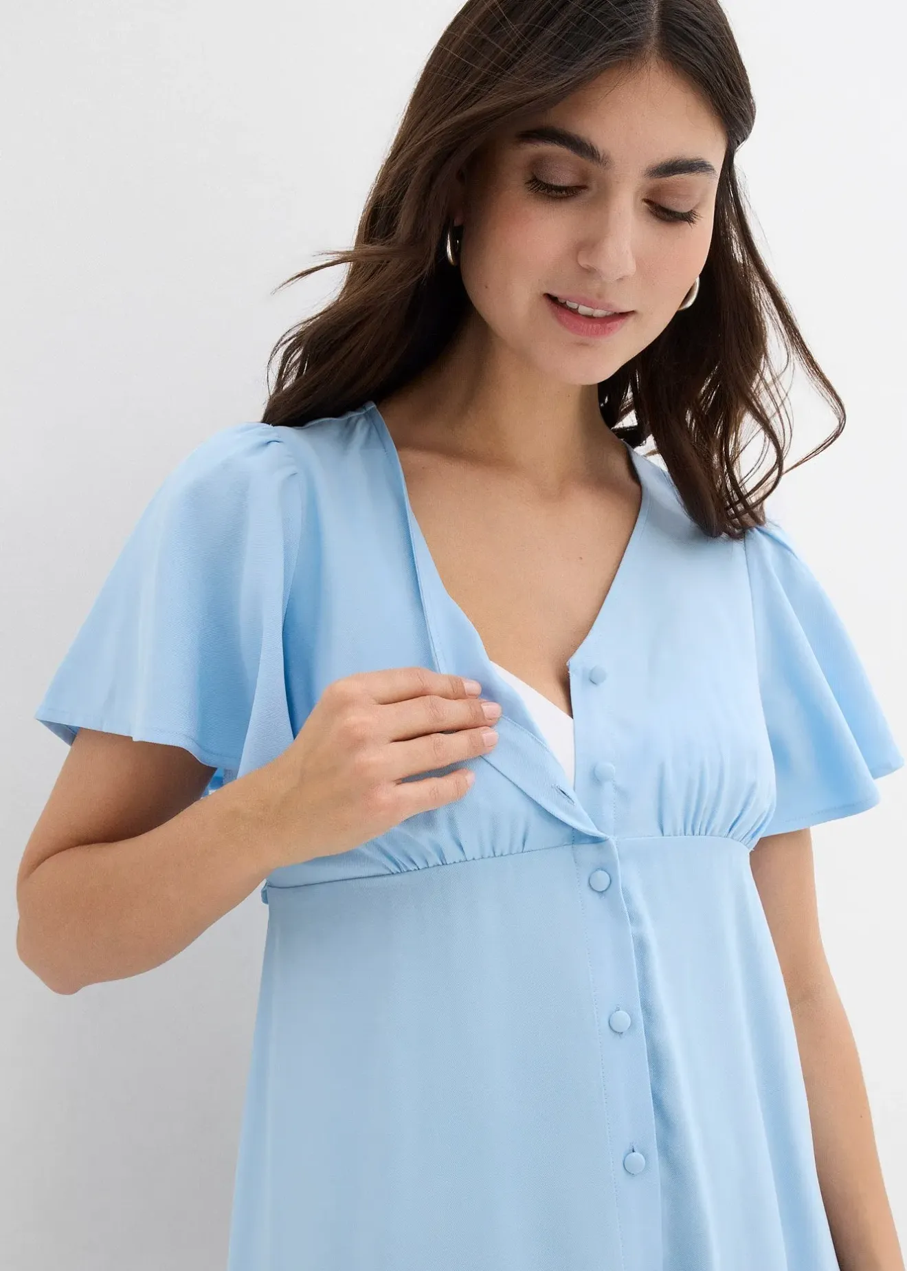 Robe midi douce en viscose mélangée avec col en V et manches courtes papillon. Patte de boutonnage sur toute la longueur pour faciliter l’allaitement et l’habillage. Petit bouton-pression caché pour éviter une position désagréable de la patte de boutonnage au niveau de la poitrine. À porter avec ou sans le lien amovible. Dans le dos, étroite bande élastique de maintien pour une coupe optimale.
