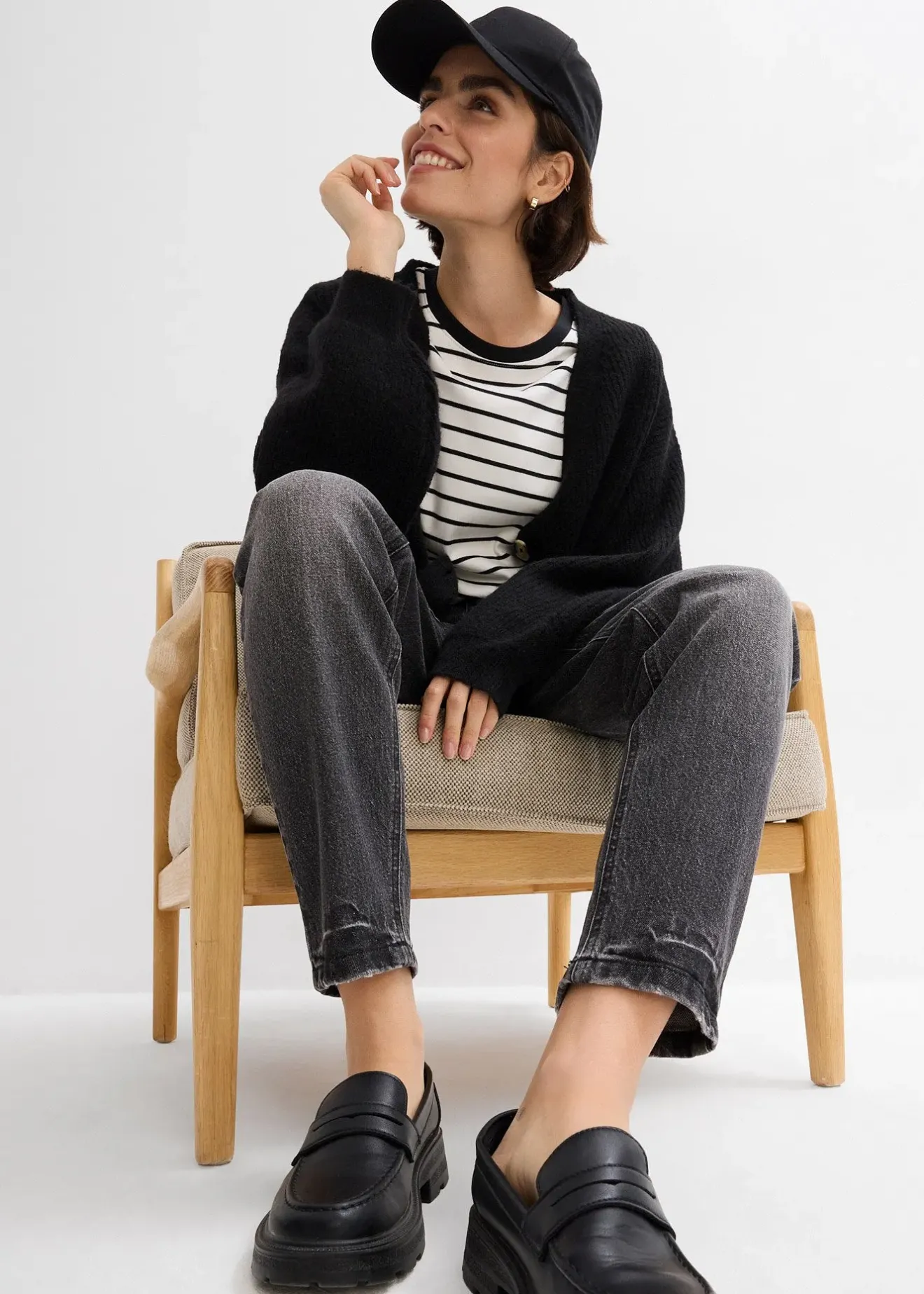 Jean mom taille haute en denim de coton épais qui s’assouplit au fil des utilisations et des lavages.