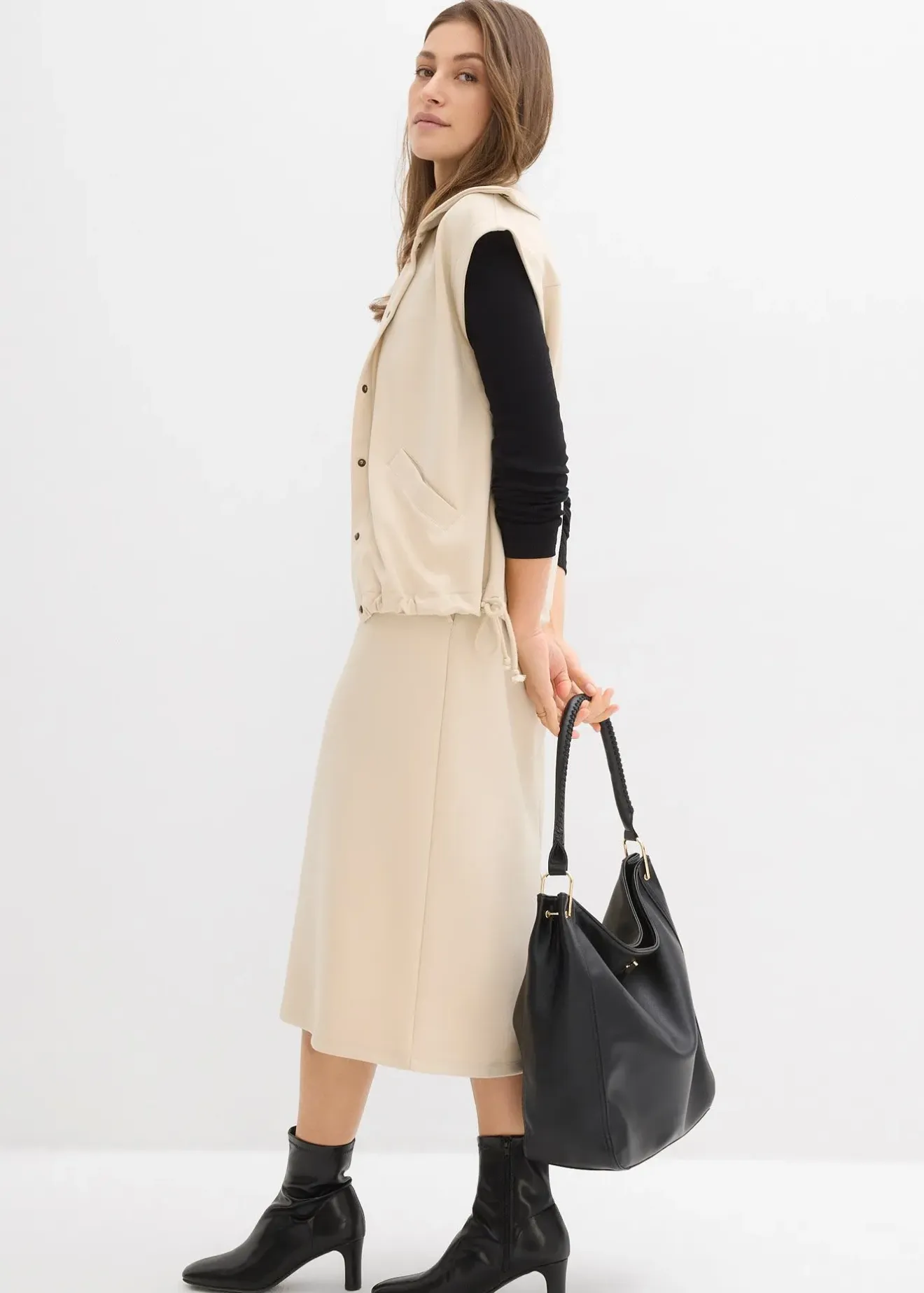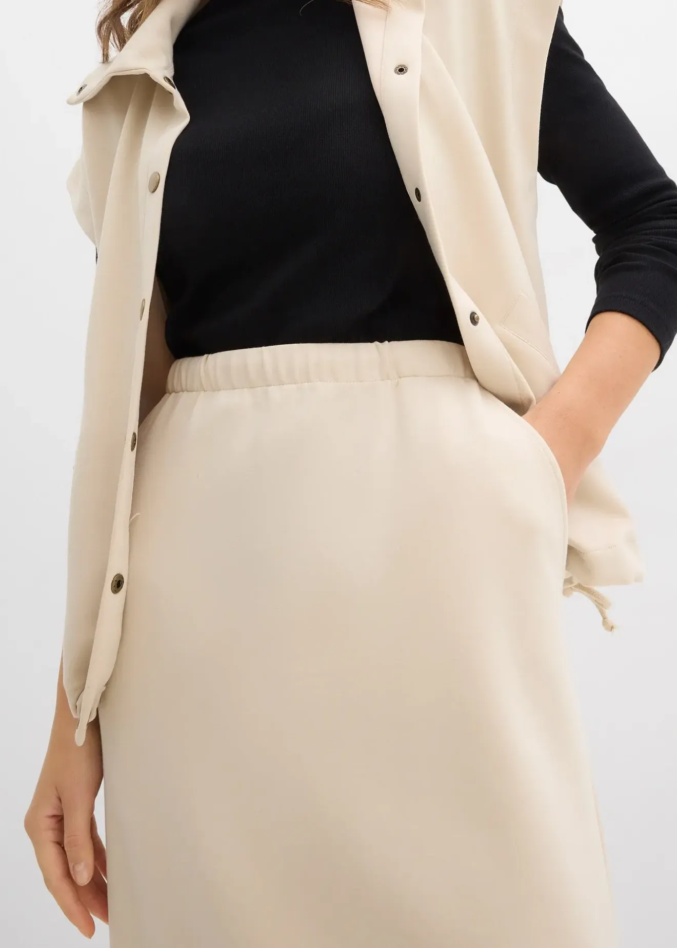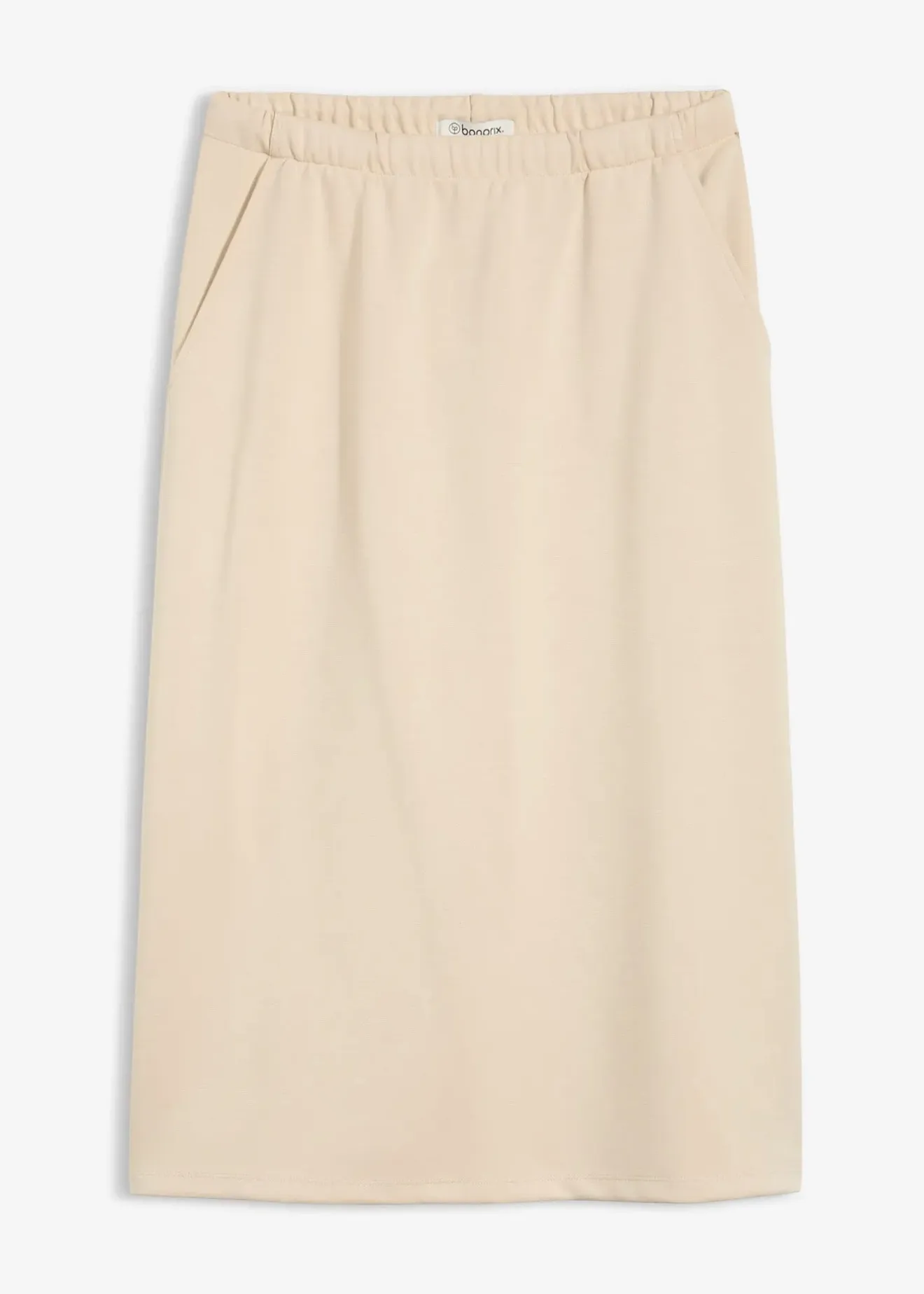 Jupe midi en matière douce. Taille élastiquée avec cordon de serrage et fente dos.