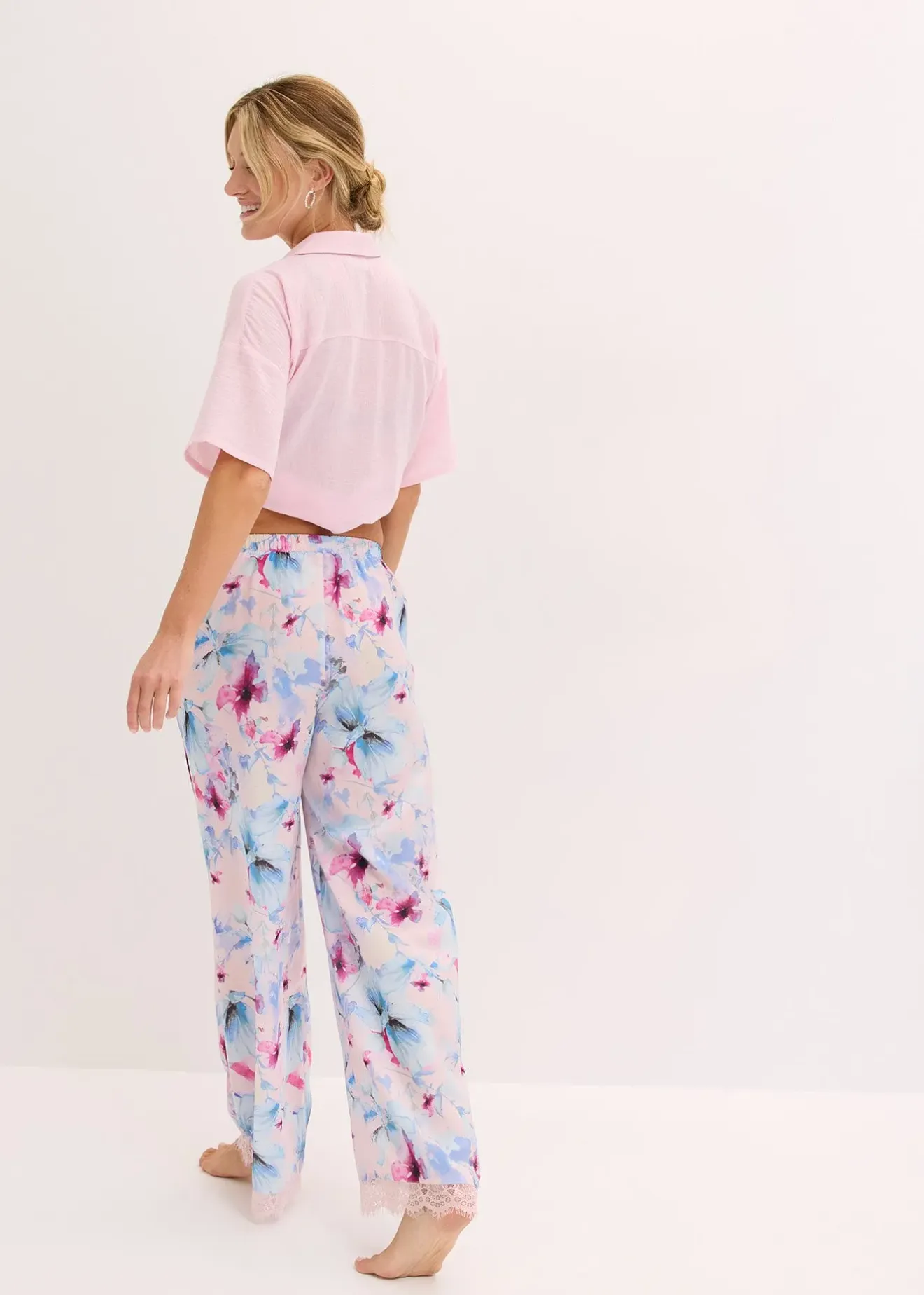 Pantalon fluide en satin avec poches et dentelle en bas de jambe
