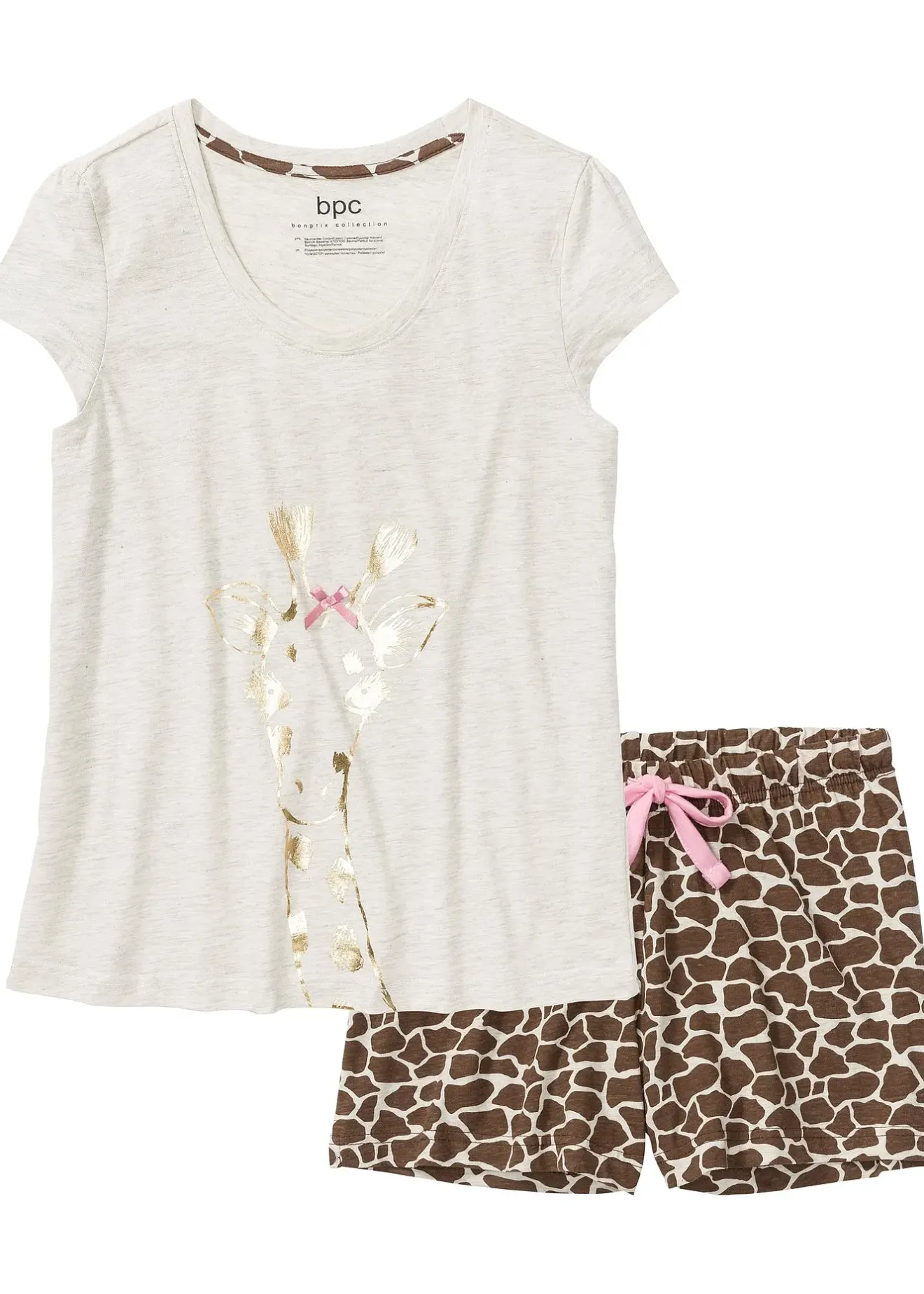 T-shirt de pyjama à col rond et manches courtes. Petites fronces aux manches et véritable nœud cousu pour une touche féminine. Short élastiqué à la taille avec cordon réglable.