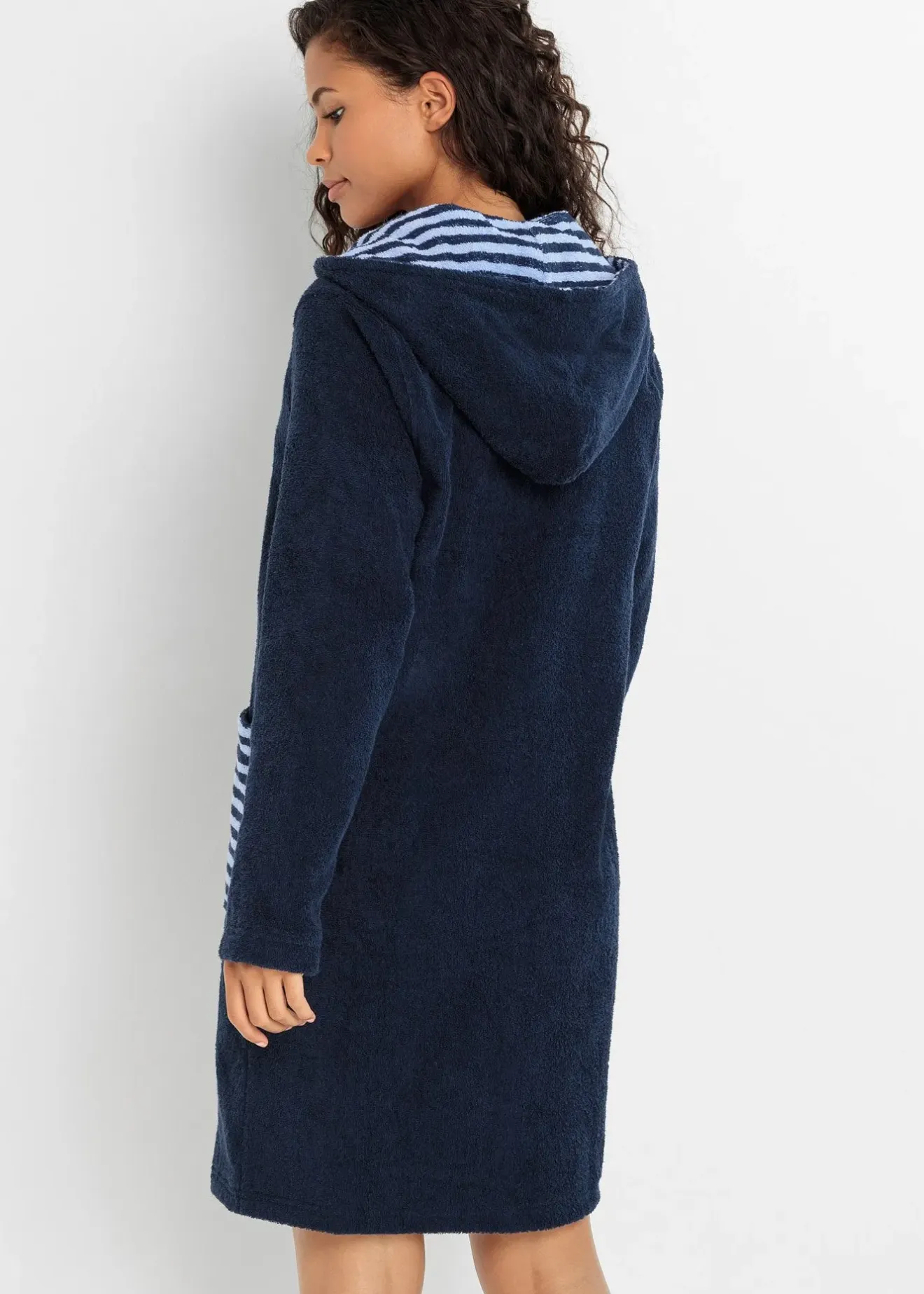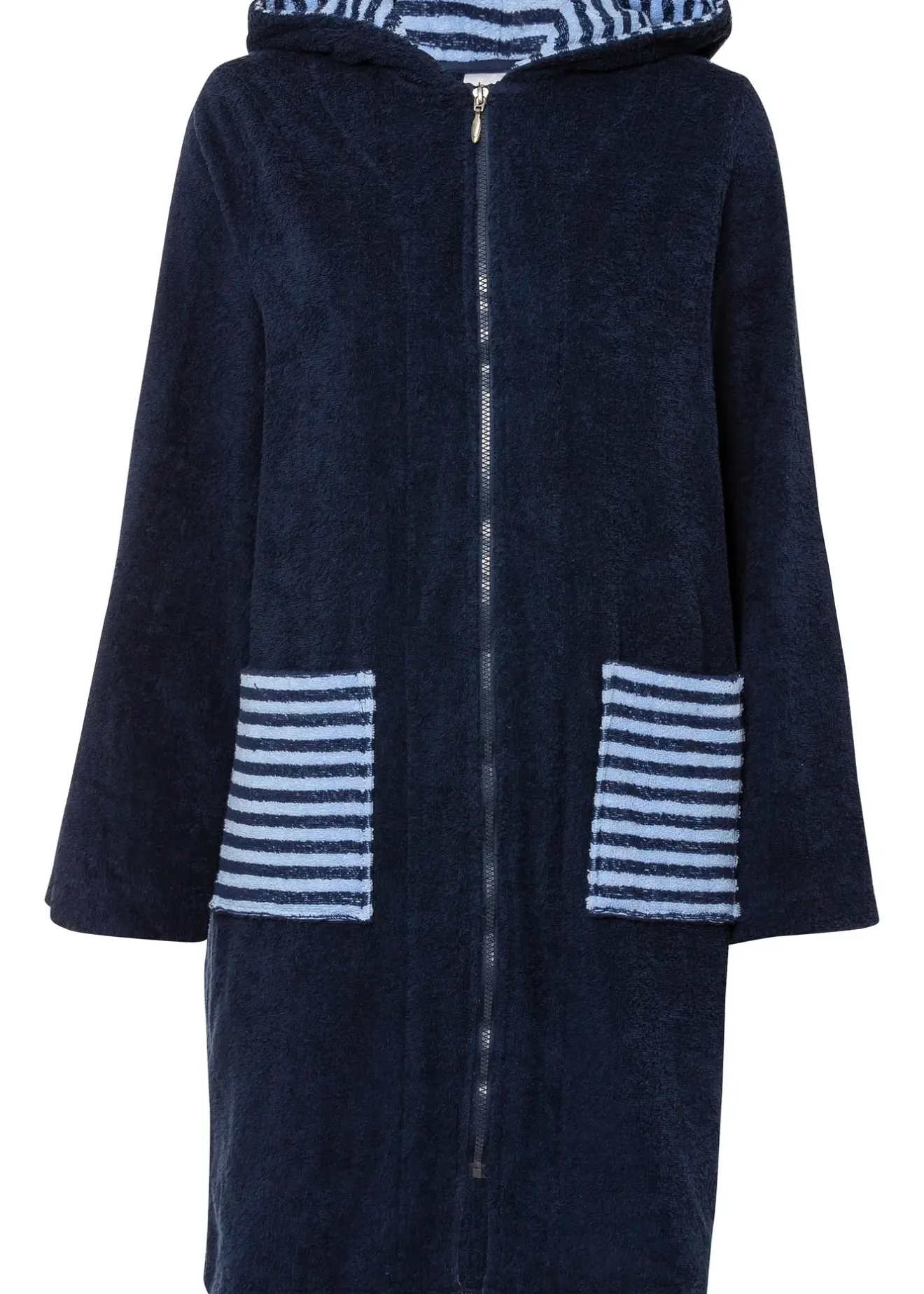 Peignoir de bain douillet en éponge avec poches plaquées, fermeture zippée et capuche.