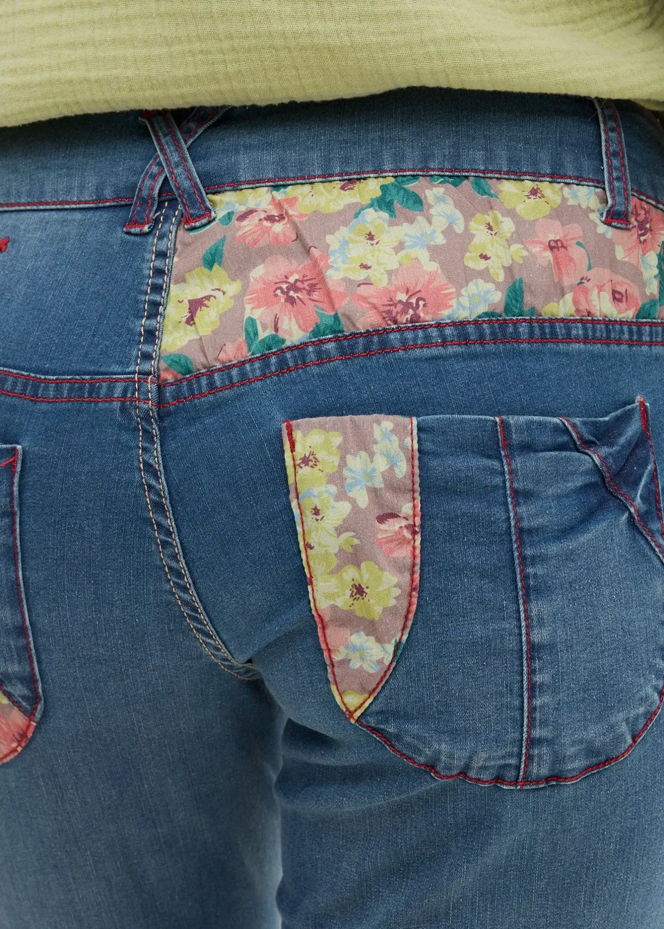 Bermuda en jean cool et taille basse à motifs contrastants. Boutons colorés et empiècements en tissu pour une allure décontractée et moderne.