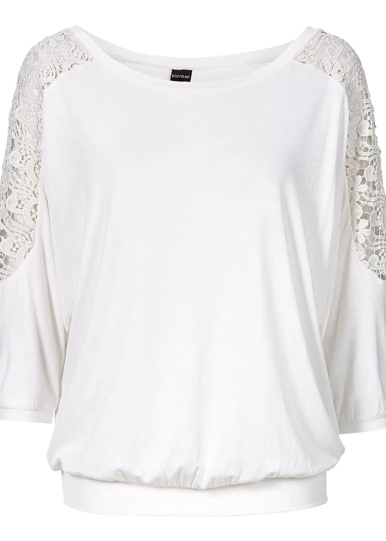 Féminin, ce T-shirt oversize de BODYFLIRT arbore une encolure bateau mode et flatteuse ainsi que des manches 3/4 agrémentées de dentelle. Ses finitions élastiquées à la base et aux manches lui assurent une coupe décontractée et un ajustement optimal. Sa matière douce et agréable à porter renforce le confort. Il se combine facilement avec une jupe de longueur mini ou maxi, un sarouel ou un jean extensible pour un look décontracté ou romantique.