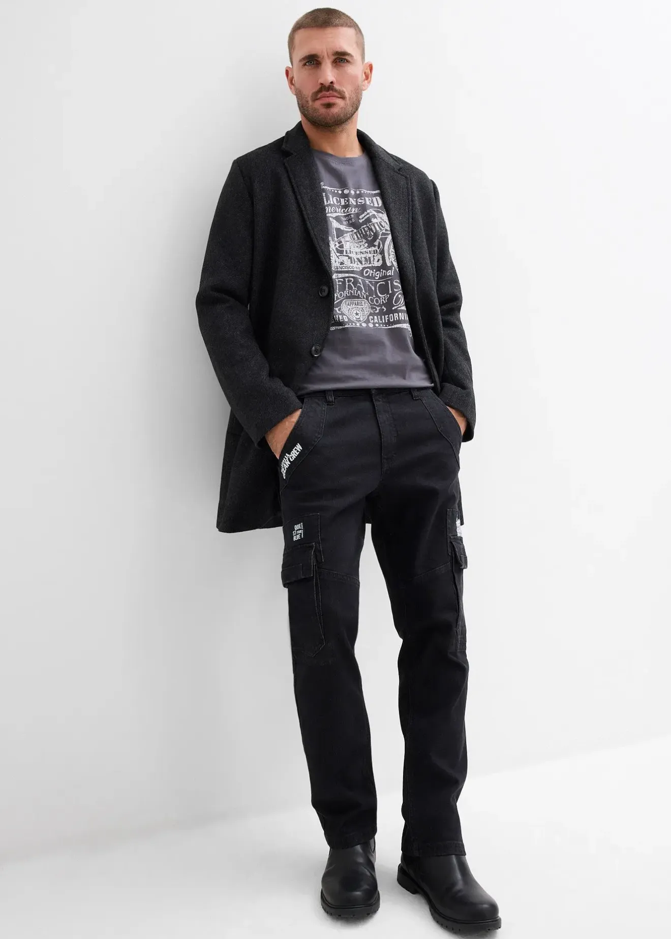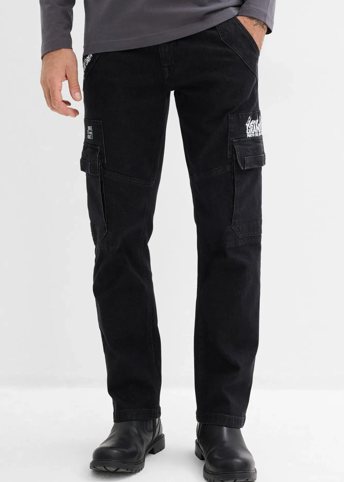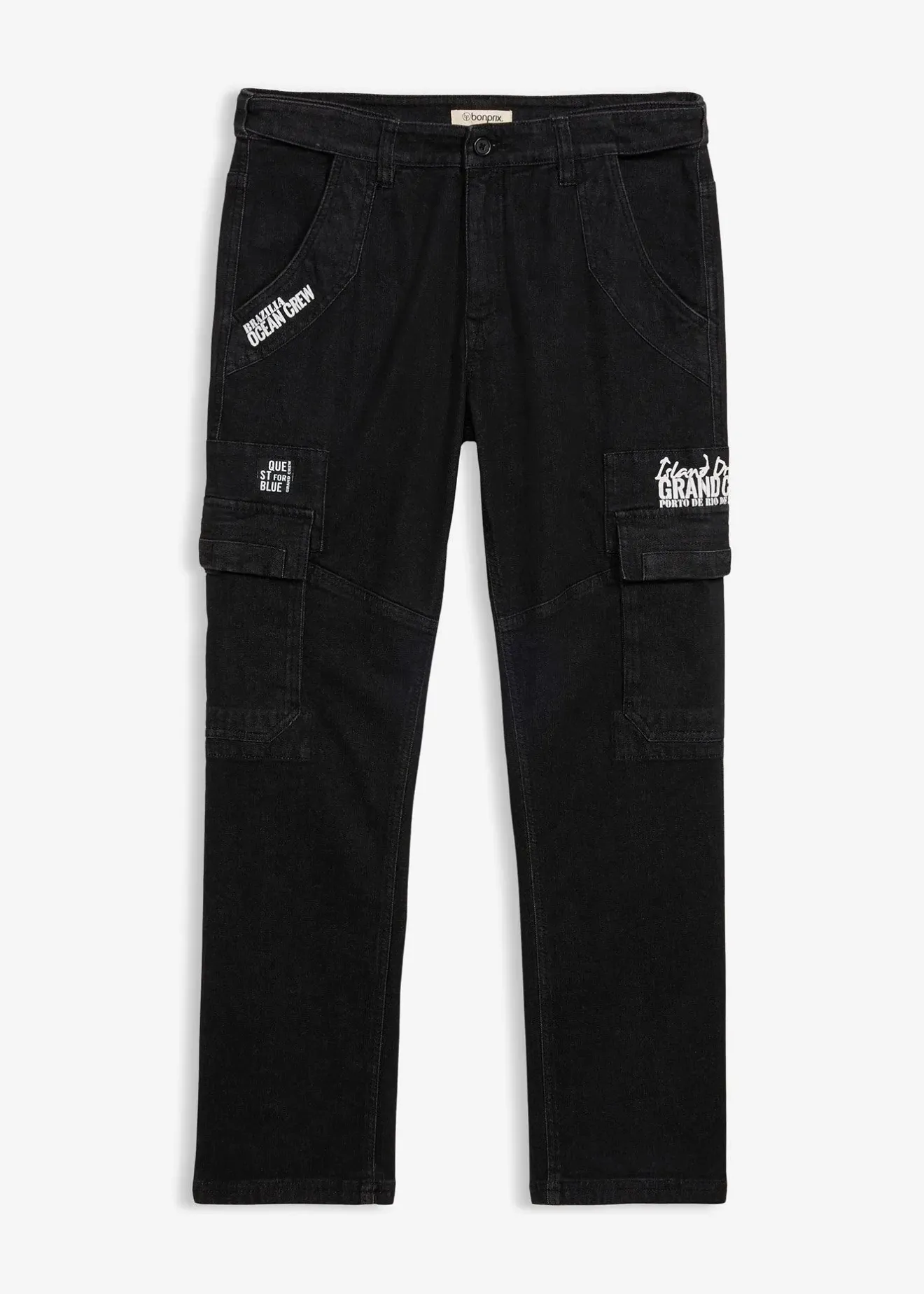 Jean cargo décontracté avec taille élastiquée, poches pratiques et toile légèrement délavée
