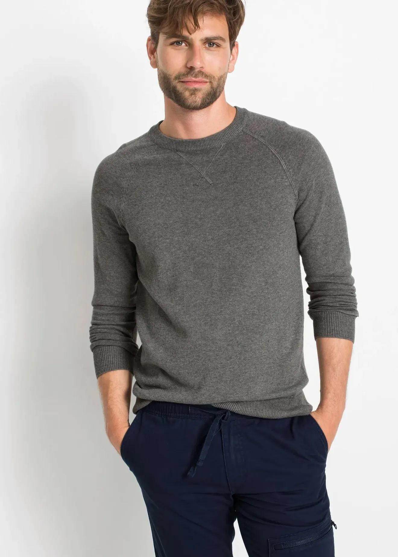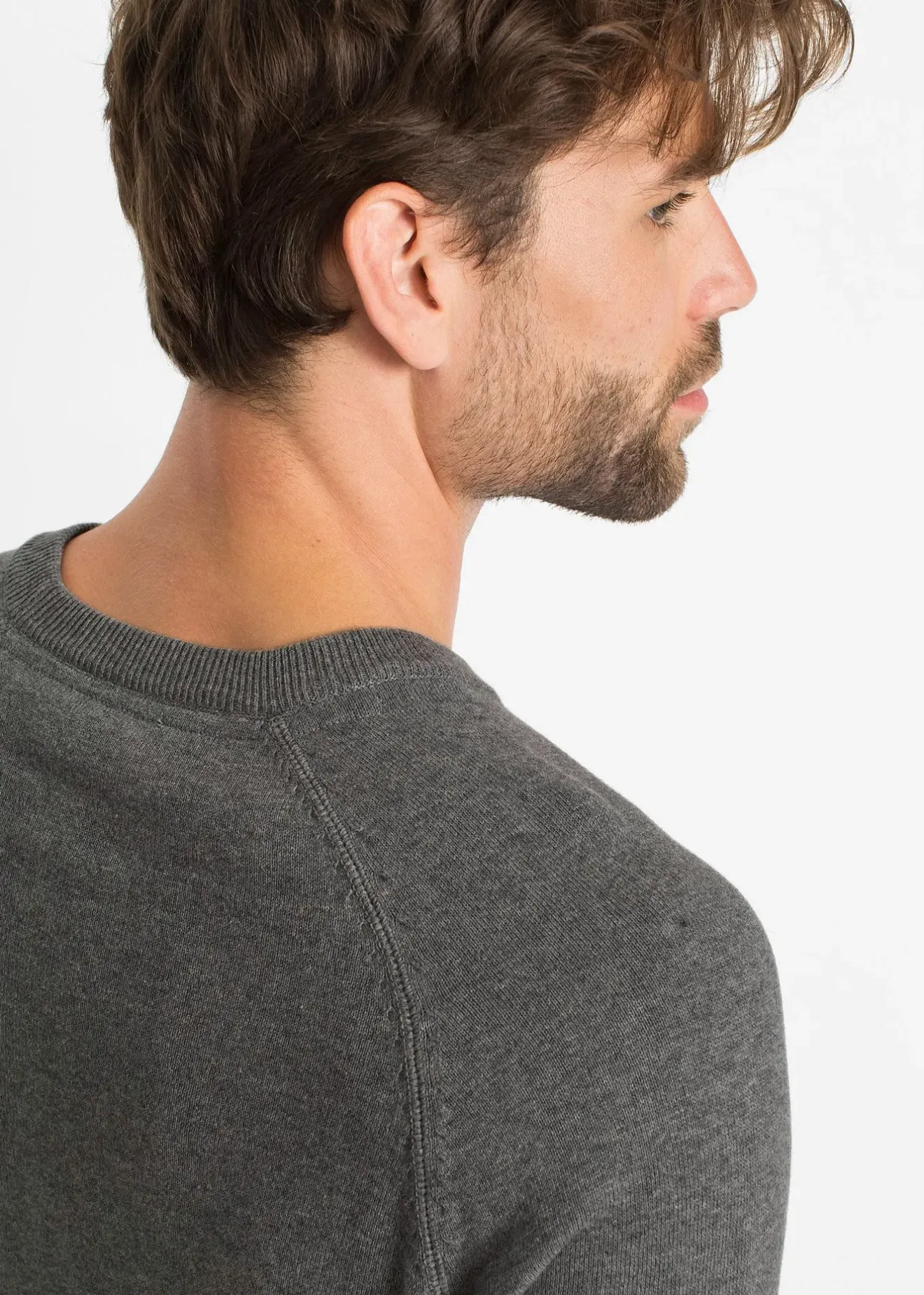Col rond et bords-côtes aux poignets et à la base, lavage machine.