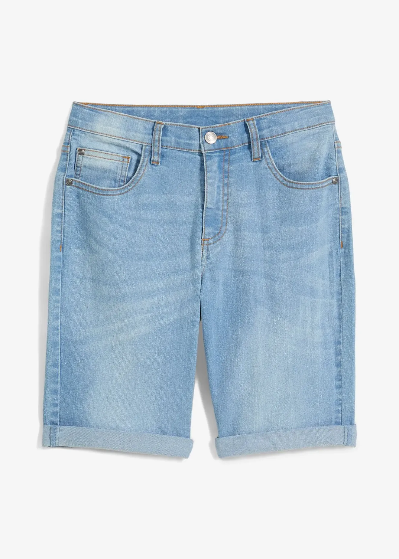 Joli bermuda slim en jean délavé et extensible. Facile à combiner et idéal au quotidien. Taille réglable grâce à une bande élastique à boutonner.