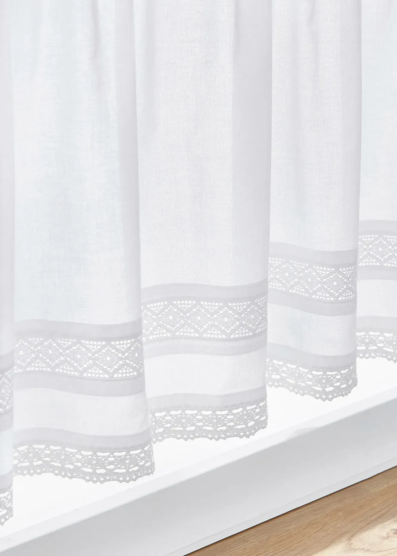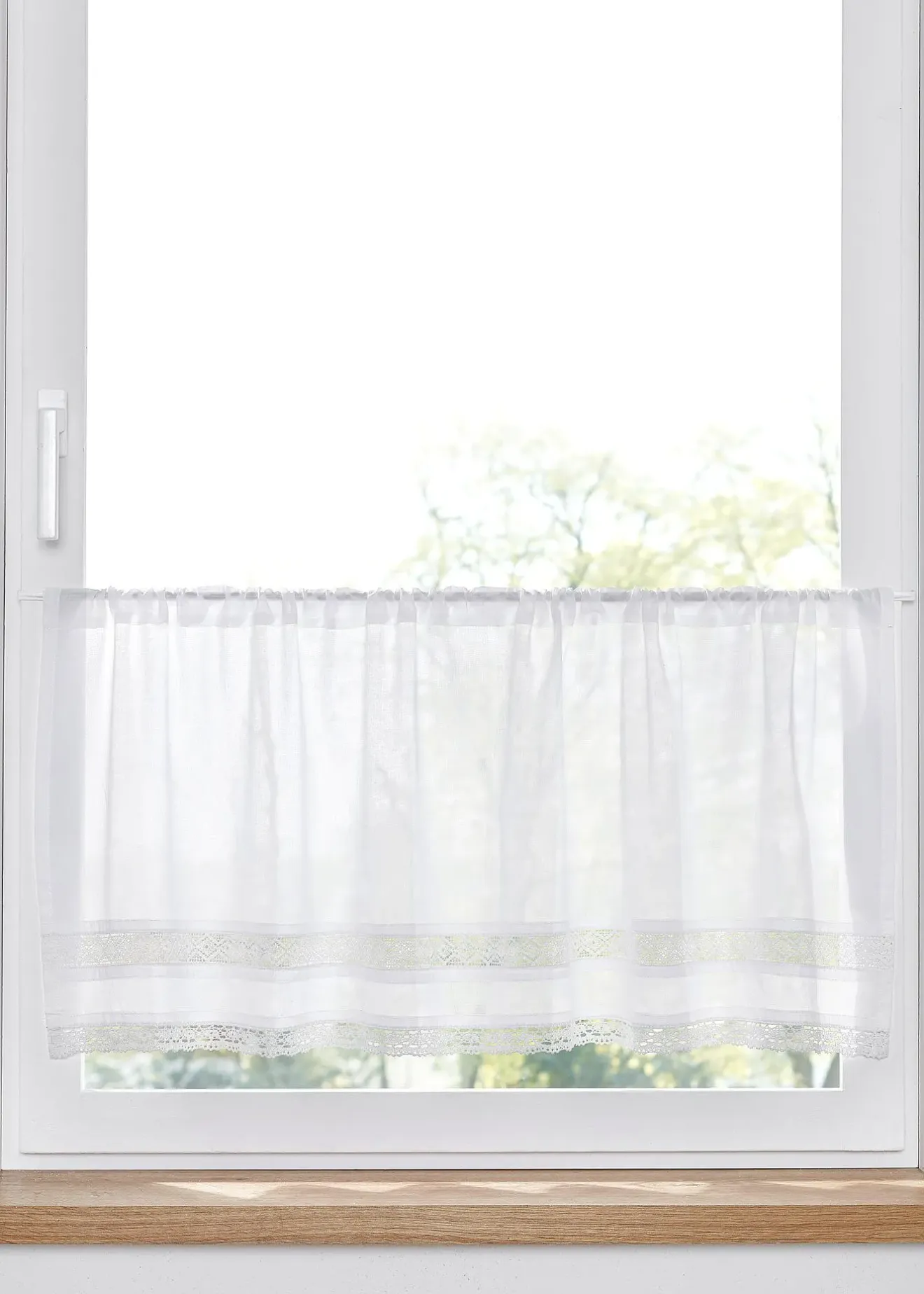 Brise-bise raffiné en belle matière coton avec bordure en dentelle. Ce brise-bise embellit votre pièce. Coulisse passe-tringle pour diamètre max. 3 cm.