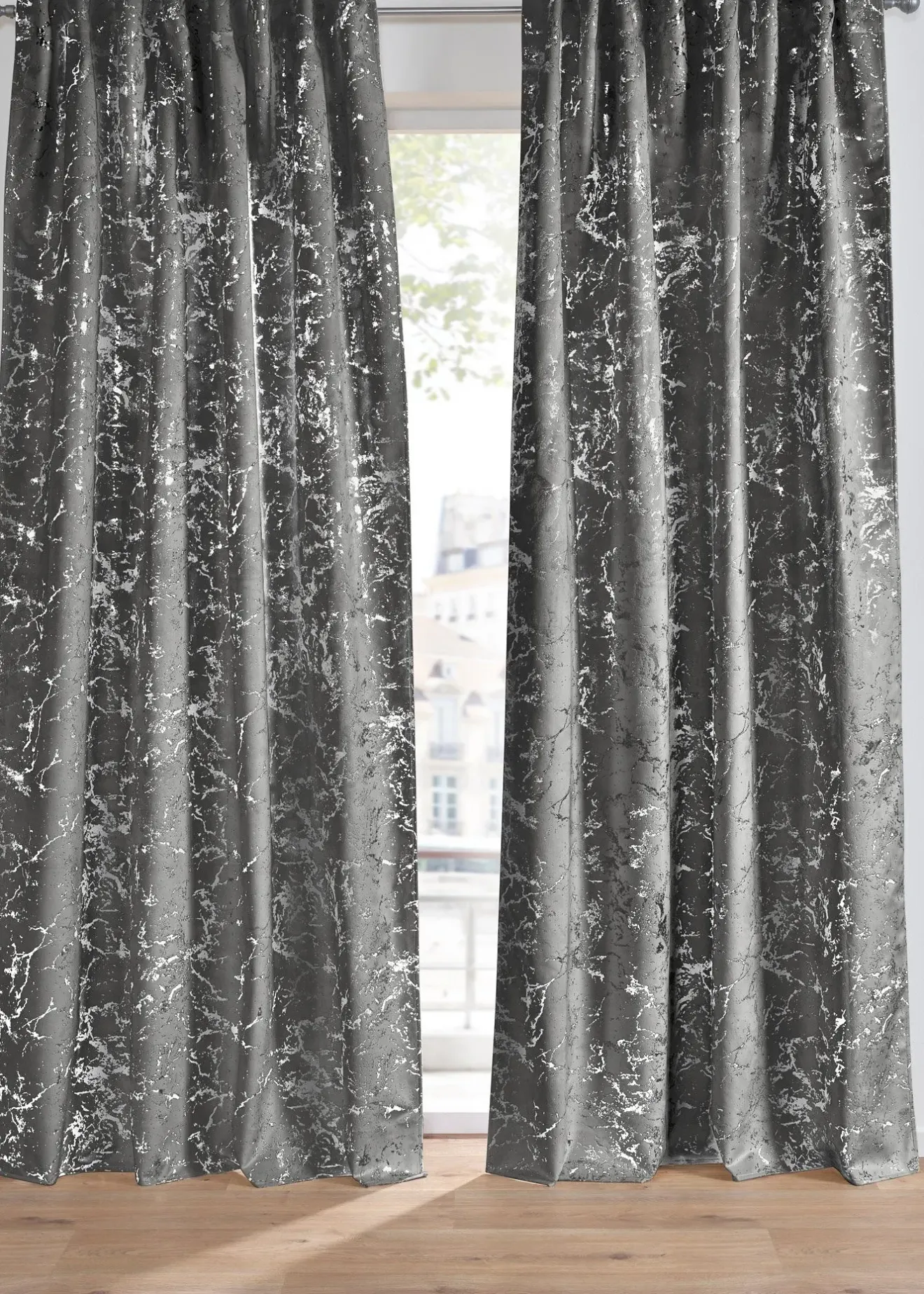Rideau occultant en tissu lourd avec recto à imprimé marbré brillant. Verso uni. Décoratif le jour, il protège de la lumière la nuit.
