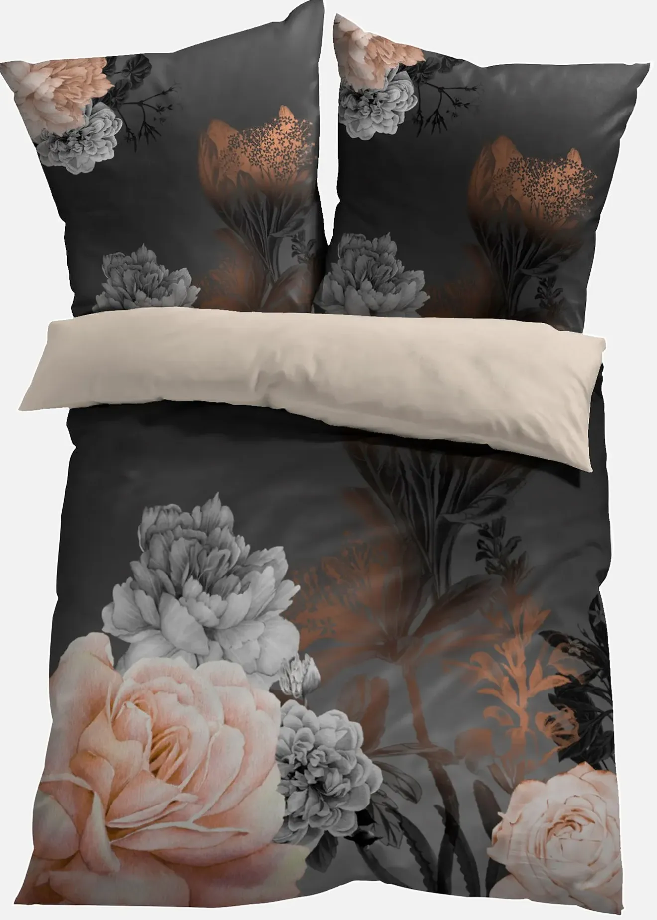 Motif floral sur fond sombre. Parure de lit réversible, envers uni.