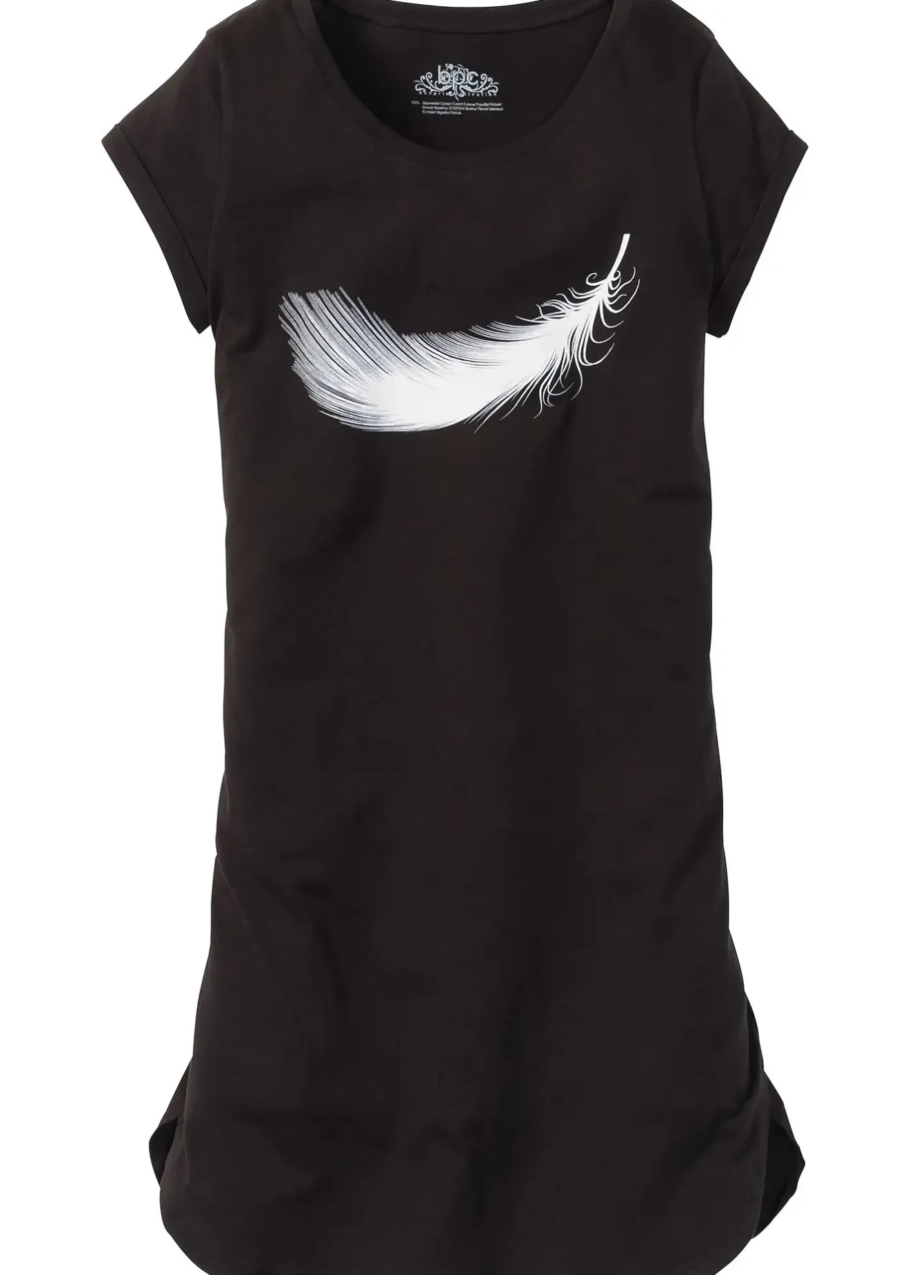 Chemise de nuit à manches courtes, coupe ample et matière agréable pour la peau. Encolure ronde dégagée. Forme droite et base arrondie. Ravissant imprimé plume sur le devant.