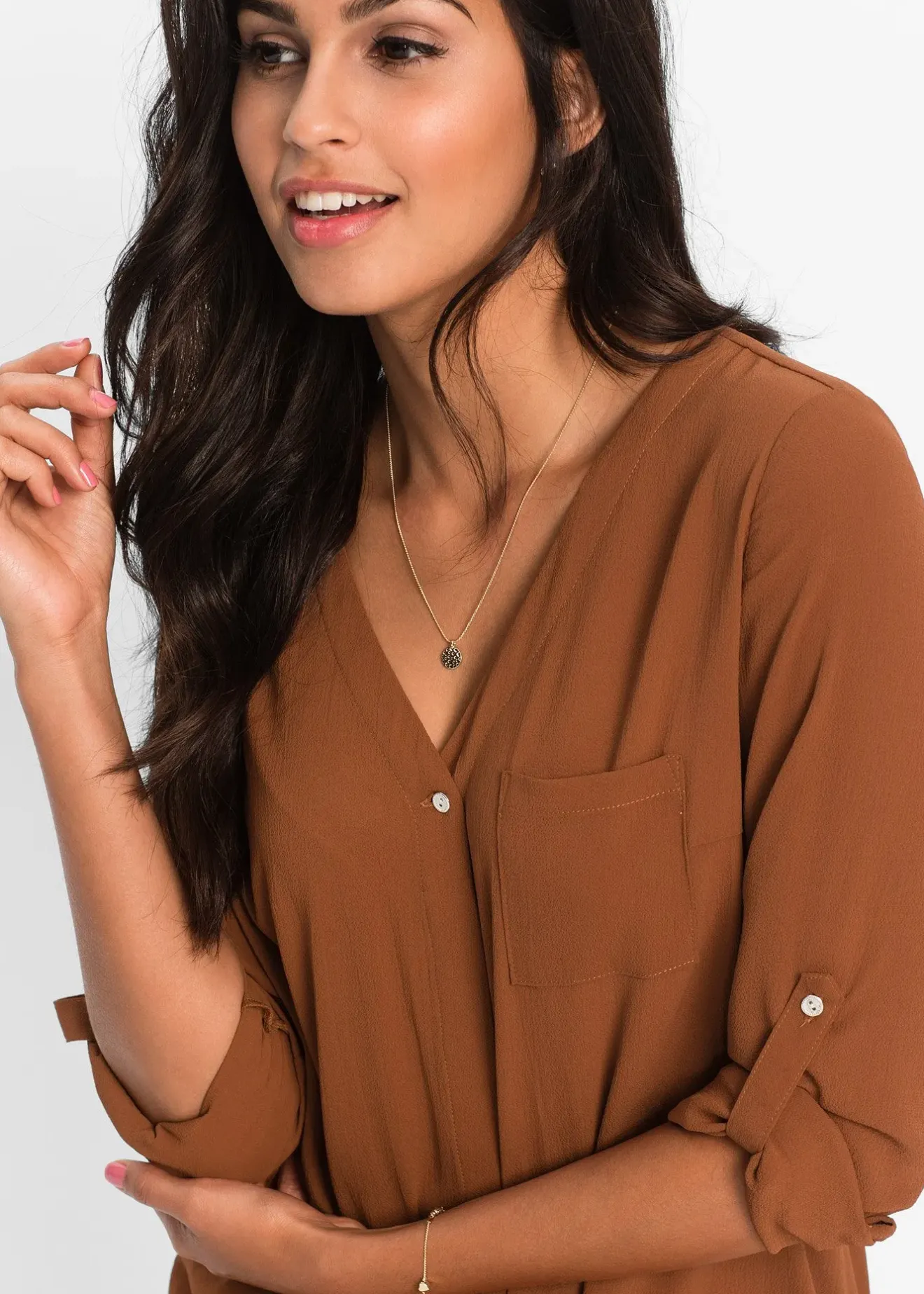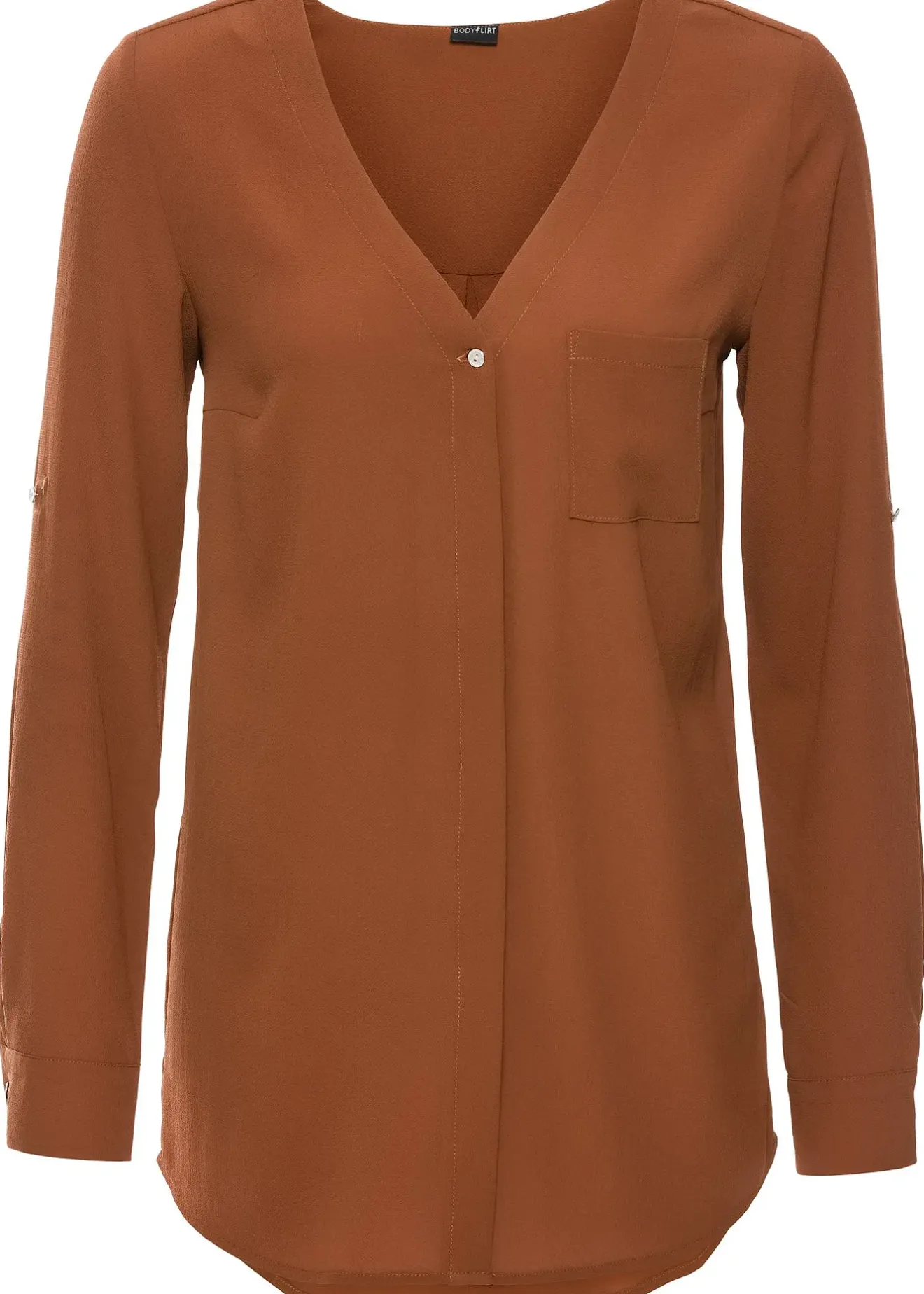 Chemisier moderne à manches longues avec un décolleté plongeant en V, patte de boutonnage invisible et tissu crêpe légèrement transparent. Les manches se retroussent avec style et se fixent par une patte boutonnée. Long. env. 74 cm.