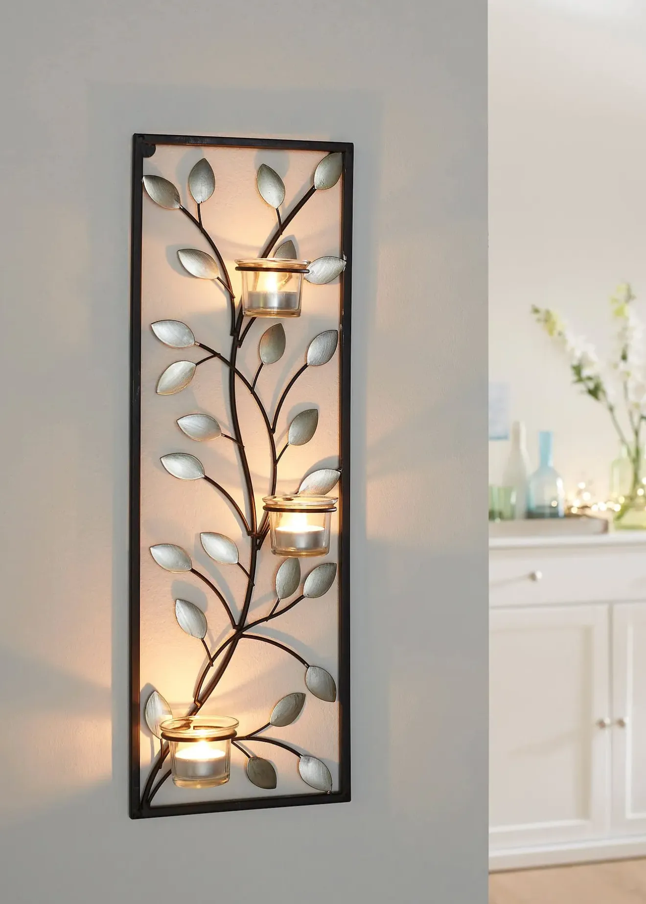 Ce magnifique bougeoir mural habille vos murs en un tour de main. Support mural élégant en métal laqué noir avec 3 photophores en verre transparent inclus (bougies non fournies). Dim. H/l/P env. 54×18,5×8 cm.