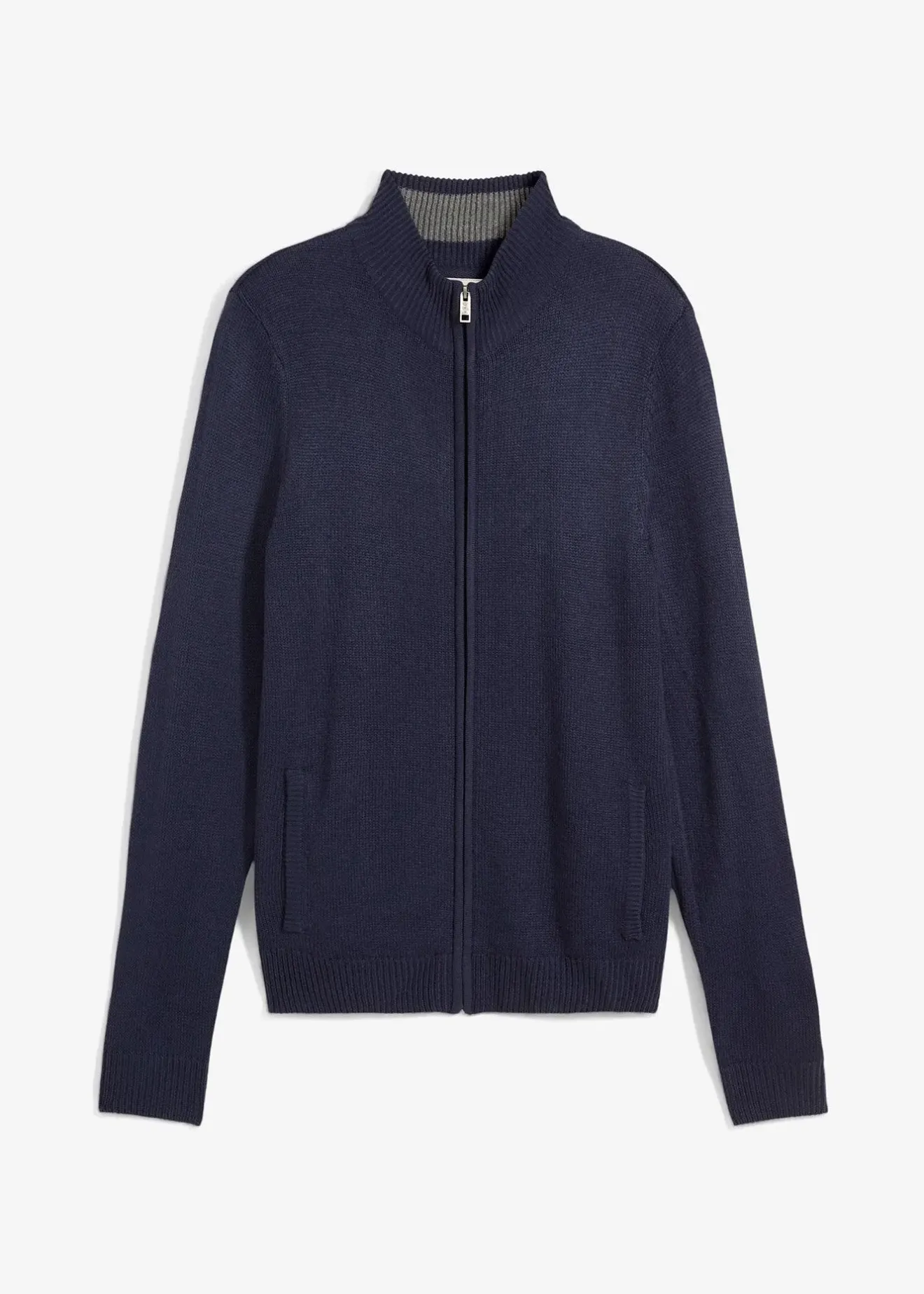 Gilet en maille à col montant et fermeture zippée devant.